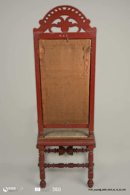 Matéria/Técnica: Madeira entalhada, torneada e policromada ( pintura acharoada ); seda bordada a sedas polícromas; Cronologia: Século XVIII; Autoria: Desconhecida; Dimensões (cm): Altura: 151; Largura: 68; Comprimento: 70,5.