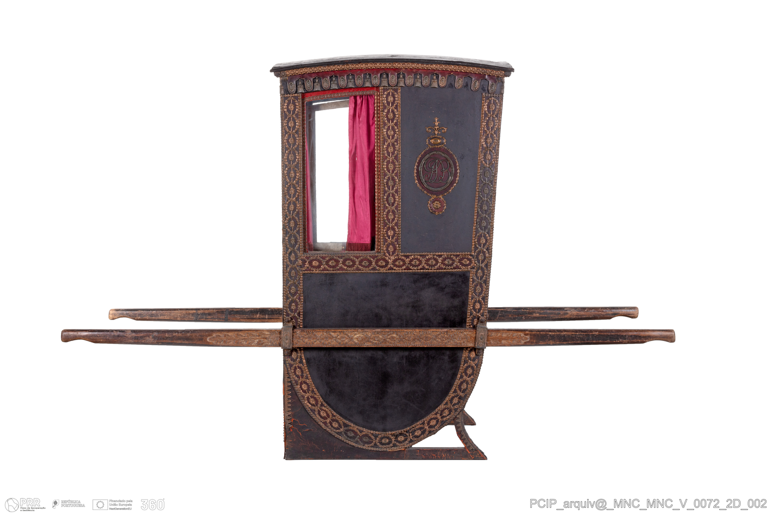 Matéria/ Técnica: Madeira; couro; marroquim; bronze; damasco; tafetá de seda; vidro; palha; Cronologia: 1785 - 1810; Autoria: Desconhecida; Dimensões (cm): Altura: 158; Largura: 76; Comprimento: 237 / 94 (com e sem varais).