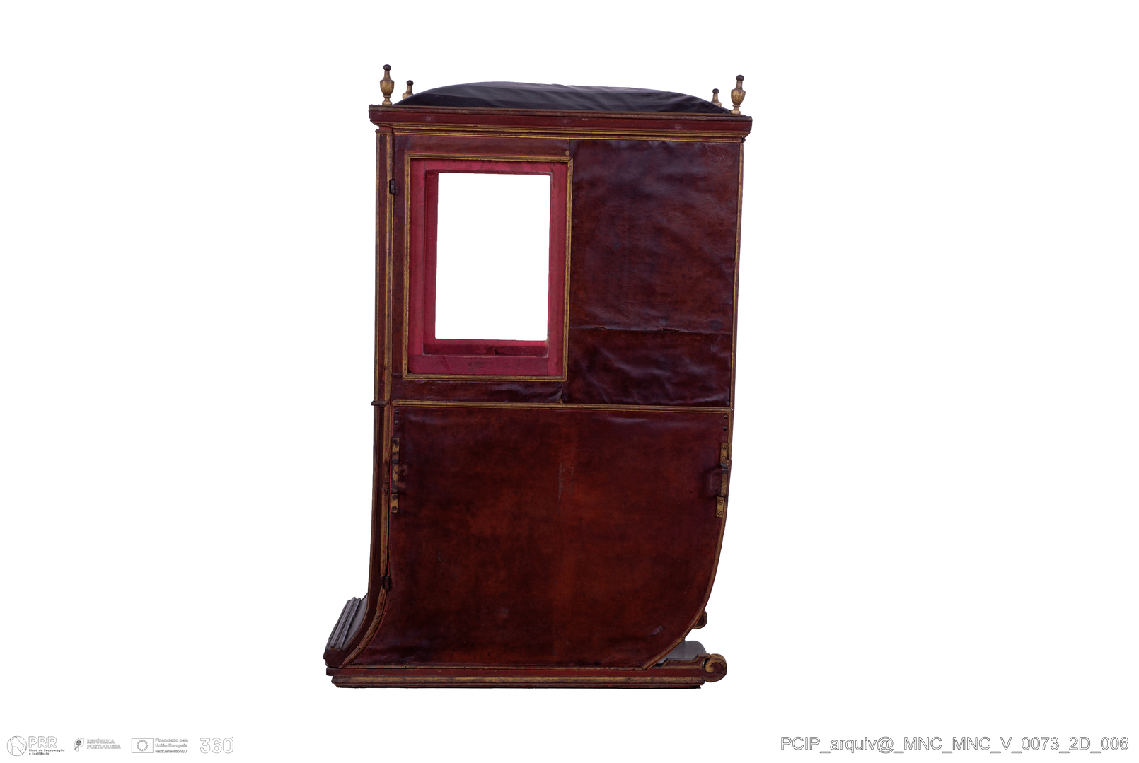 Matéria/ Técnica: Madeira; couro; marroquim; ferro; bronze; damasco; vidro; Cronologia: 1801 - 1815; Autoria: Desconhecida; Dimensões (cm): Altura: 152,5 / 142 (com e sem terminais); Largura: 75,5; Comprimento: 93.