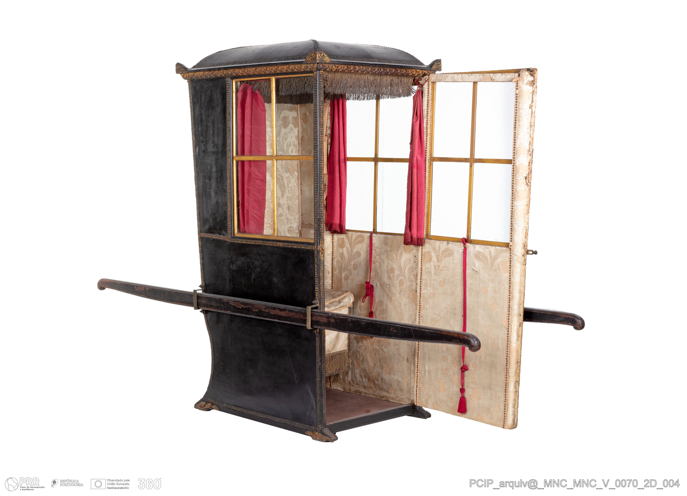 Matéria/ Técnica: Madeira; bronze; cetim; tafetá de seda; couro; vidro; franja de ouro; Cronologia: 1830 - 1855; Autoria: Desconhecida; Dimensões (cm): Altura: 162; Largura: 73; Comprimento: 234 / 89 (com e sem varais).