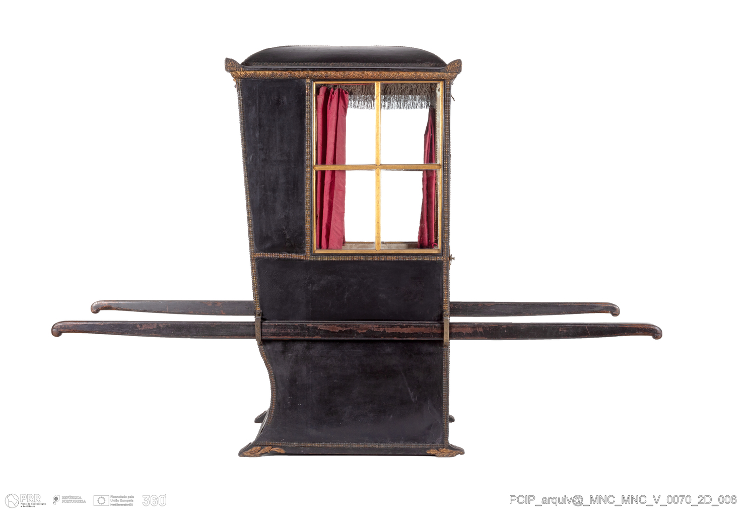 Matéria/ Técnica: Madeira; bronze; cetim; tafetá de seda; couro; vidro; franja de ouro; Cronologia: 1830 - 1855; Autoria: Desconhecida; Dimensões (cm): Altura: 162; Largura: 73; Comprimento: 234 / 89 (com e sem varais).