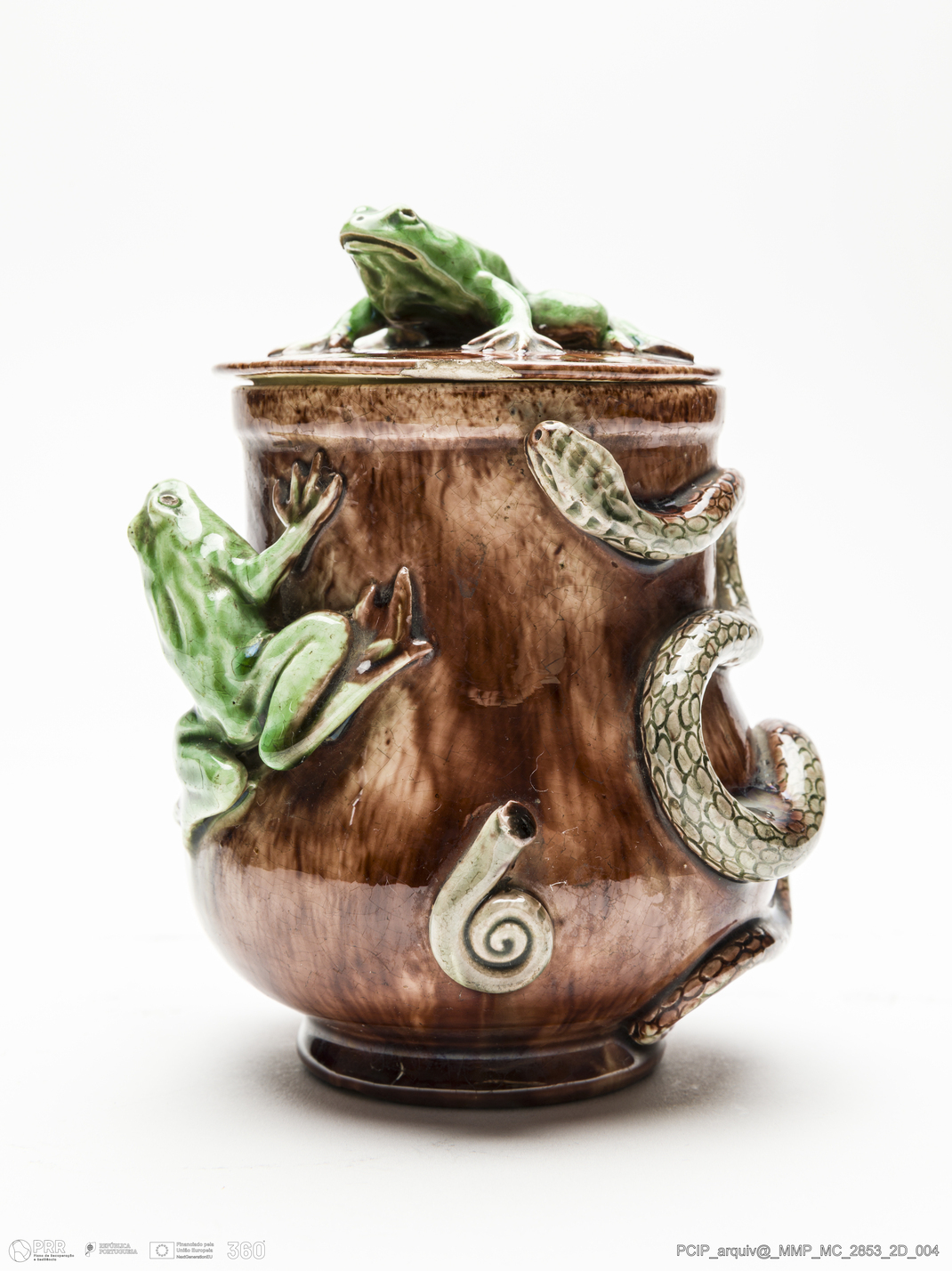 Matéria/Técnica: Barro branco rodado e moldado. Vidrado polícromo castanho com escorridos, verde, cinzento, amarelo e camurça; Cronologia: 1902-19025; Autoria: António Alves Cunha, Caldas da Rainha; Dimensões (cm): Altura: 12,1; Largura: 9,5.