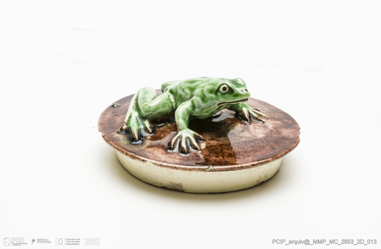 Matéria/Técnica: Barro branco rodado e moldado. Vidrado polícromo castanho com escorridos, verde, cinzento, amarelo e camurça; Cronologia: 1902-19025; Autoria: António Alves Cunha, Caldas da Rainha; Dimensões (cm): Altura: 12,1; Largura: 9,5.