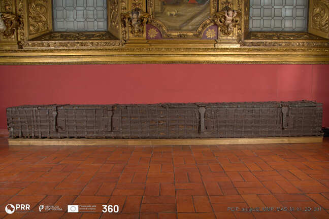 Matéria/Técnica: Estrutura em madeira revestida por chapas de ferro forjado fixadas por pregos de cabeça facetada; Cronologia: Séculos XVI-XVII; Autoria: Desconhecida; Dimensões (cm): Altura: 43; Largura: 51; Comprimento: 407.