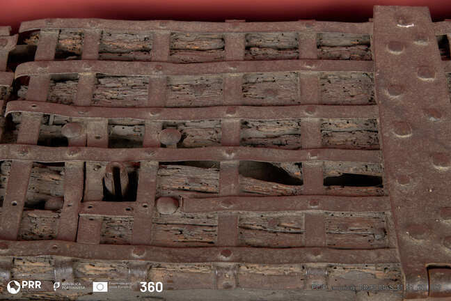 Matéria/Técnica: Estrutura em madeira revestida por chapas de ferro forjado fixadas por pregos de cabeça facetada; Cronologia: Séculos XVI-XVII; Autoria: Desconhecida; Dimensões (cm): Altura: 43; Largura: 51; Comprimento: 407.