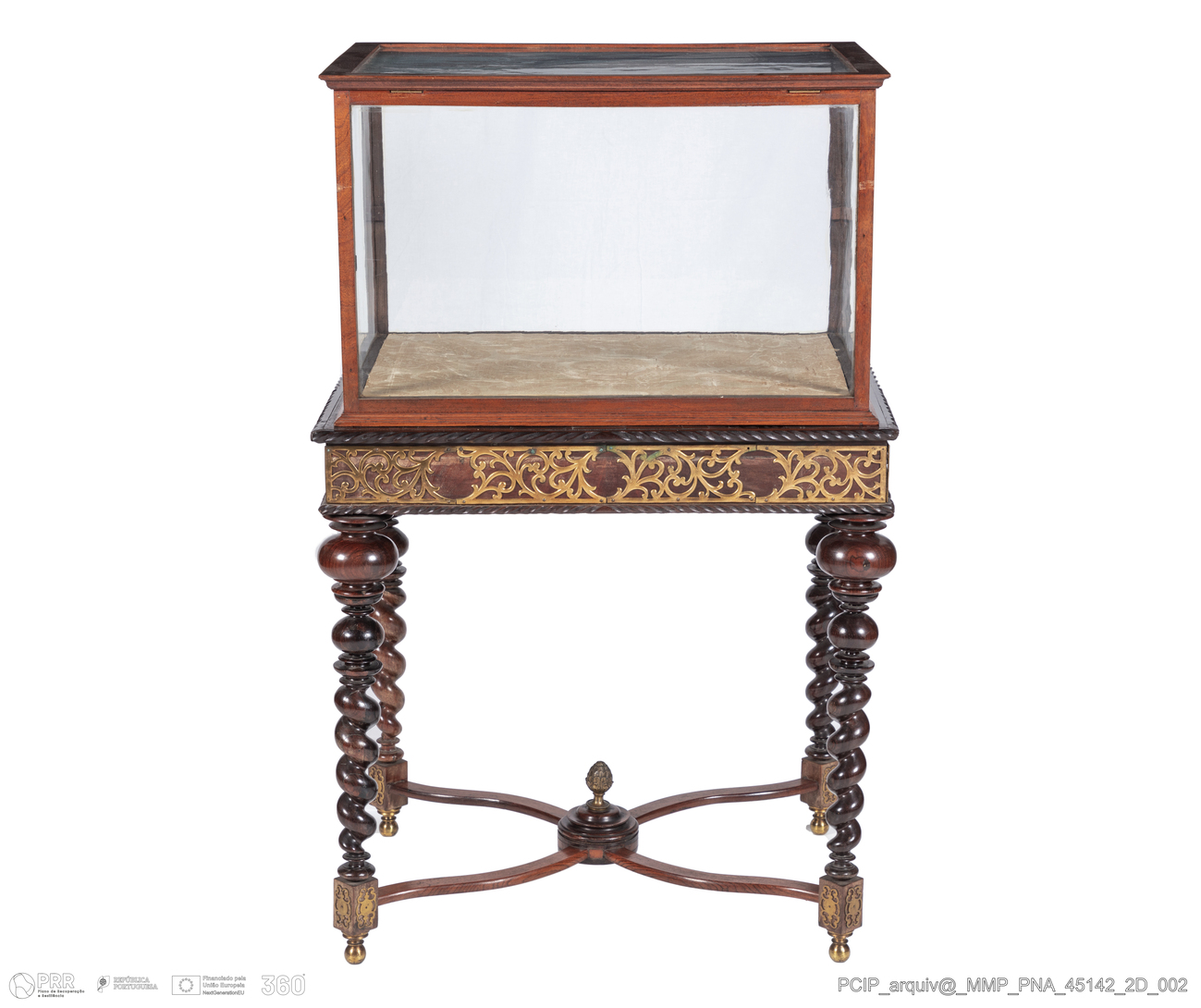 Matéria/Técnica: Amieiro, marfim, âmbar, cristal, metal; Cronologia: Século XIX; Autoria: Desconhecida; Dimensões (cm): Altura: 22; Largura: 35,5; Comprimento: 25,5.