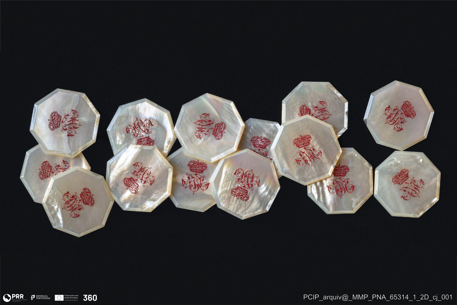 Matéria/Técnica: Madrepérola gravada e pintada; Cronologia: Desconhecida; Autoria: Desconhecida; Dimensões: Desconhecidas.