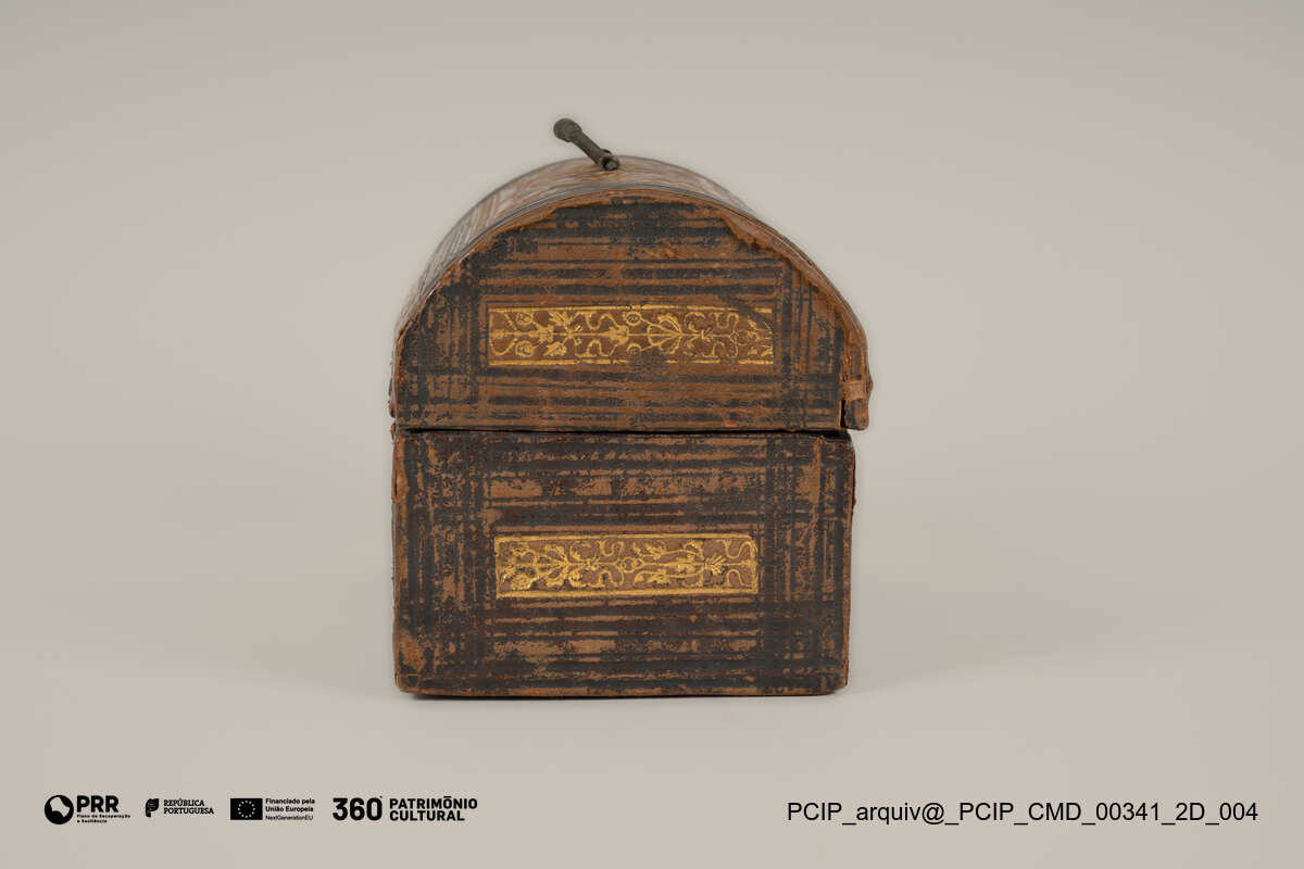Matéria/Técnica: Madeira, pele curtida, têxtil e ferro.; Cronologia: 1629; Autoria: Desconhecida; Dimensões: Altura: 10,5 cm; Largura: 17,5 cm; Profundidade: 10 cm.