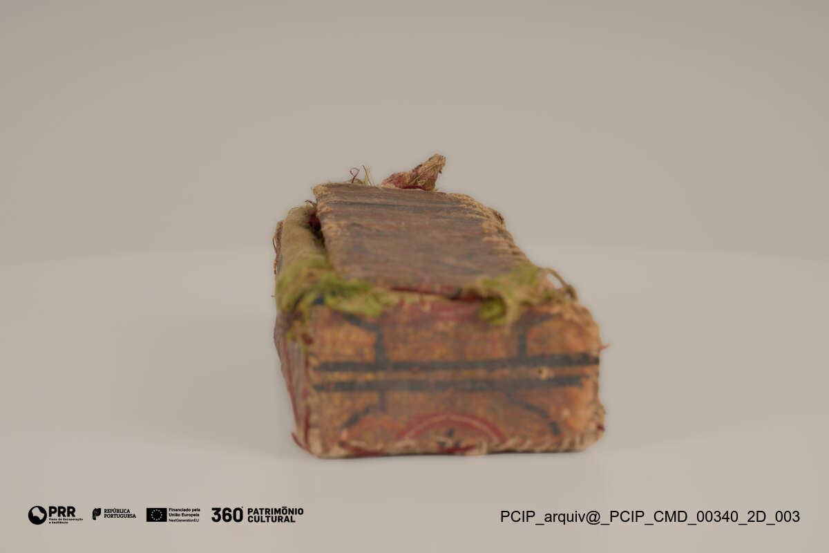 Matéria/Técnica: Madeira ?, têxtil.; Cronologia: XVI - XVII; Autoria: Desconhecida; Dimensões: Altura: 4,5 cm; Largura: 17 cm; Profundidade: 7 cm.