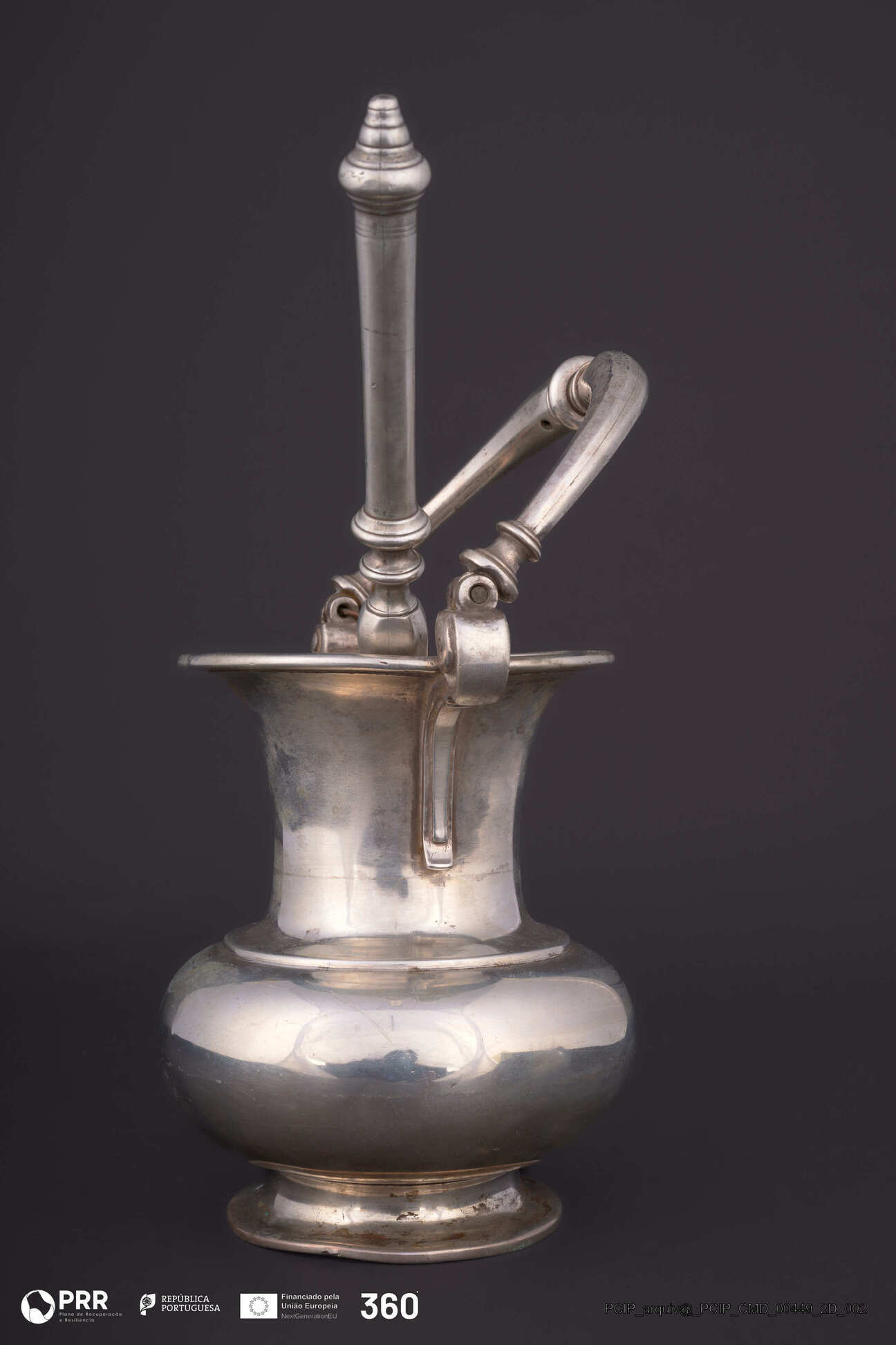 Matéria/Técnica: Prata; Cronologia: Séc. XVIII; Autoria: Desconhecida; Dimensões (cm): caldeira - Altura: 26; Largura: 12 + hissope - Altura: 30; Diâmetro: 6.