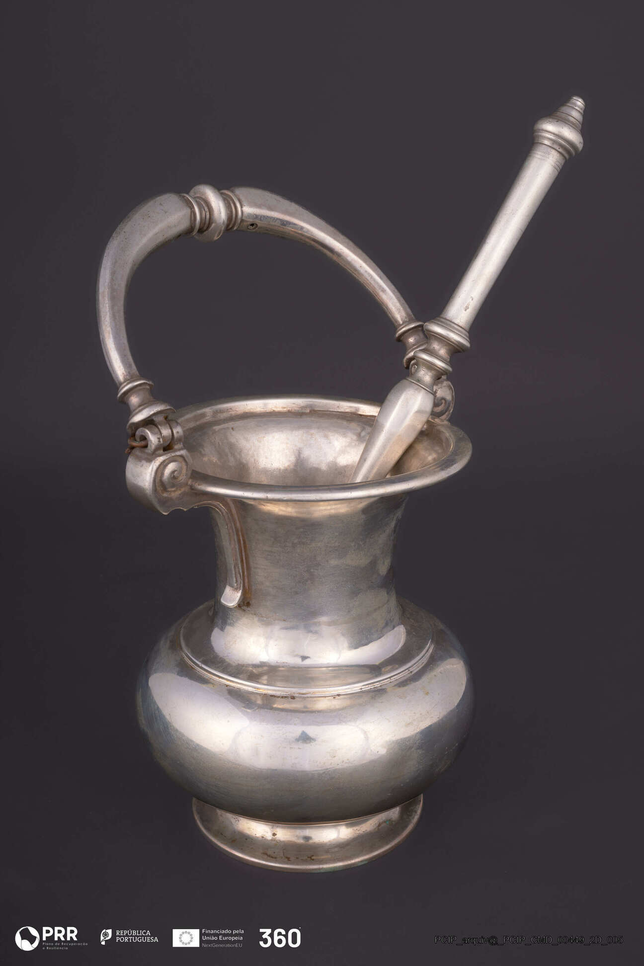 Matéria/Técnica: Prata; Cronologia: Séc. XVIII; Autoria: Desconhecida; Dimensões (cm): caldeira - Altura: 26; Largura: 12 + hissope - Altura: 30; Diâmetro: 6.