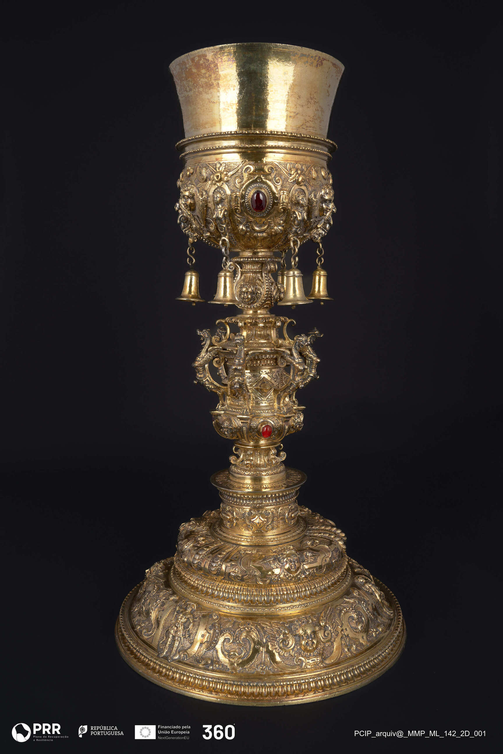 Matéria/Técnica: Prata dourada, fundida, cinzelada, relevada e incisa.; Cronologia: 1601-1615; Autoria: Ferreira, Simão; Dimensões (cm): Altura: 38,3 x Diâmetro: 20,3 (d.c. 11,3).