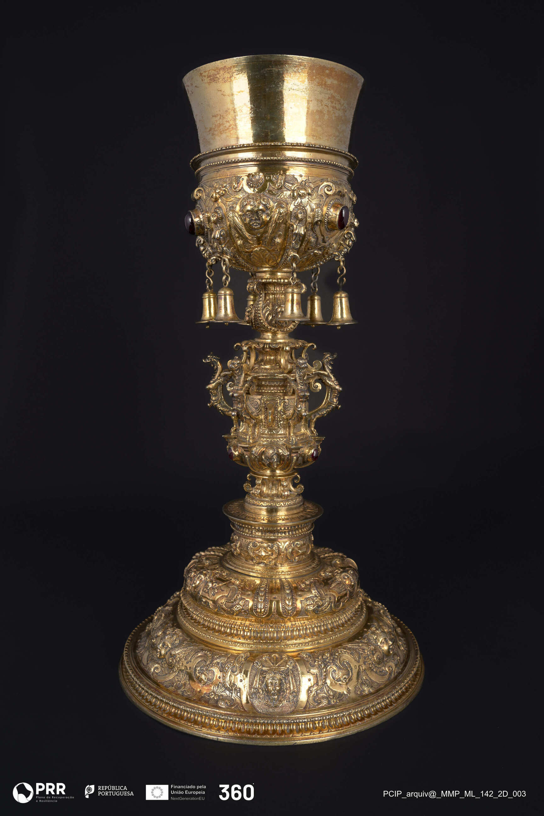 Matéria/Técnica: Prata dourada, fundida, cinzelada, relevada e incisa.; Cronologia: 1601-1615; Autoria: Ferreira, Simão; Dimensões (cm): Altura: 38,3 x Diâmetro: 20,3 (d.c. 11,3).