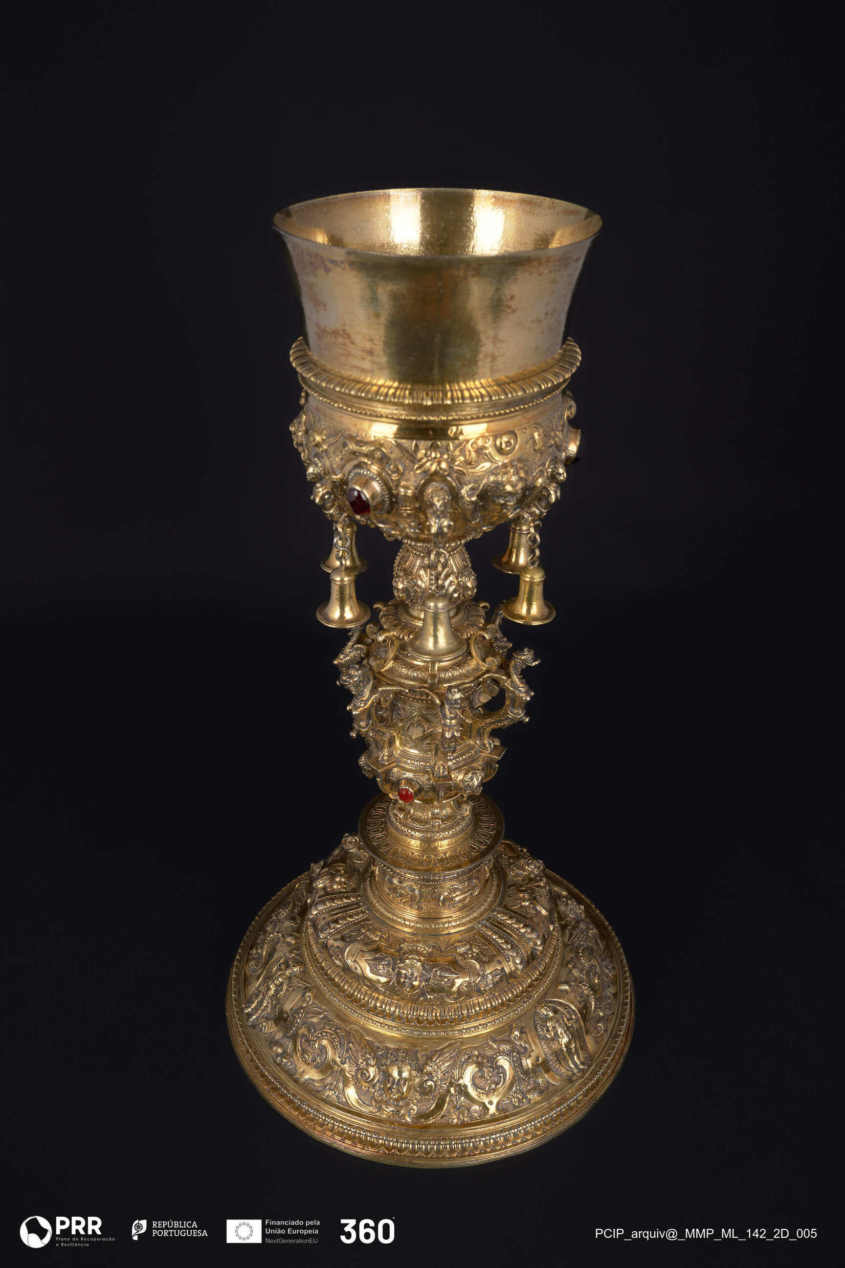 Matéria/Técnica: Prata dourada, fundida, cinzelada, relevada e incisa.; Cronologia: 1601-1615; Autoria: Ferreira, Simão; Dimensões (cm): Altura: 38,3 x Diâmetro: 20,3 (d.c. 11,3).