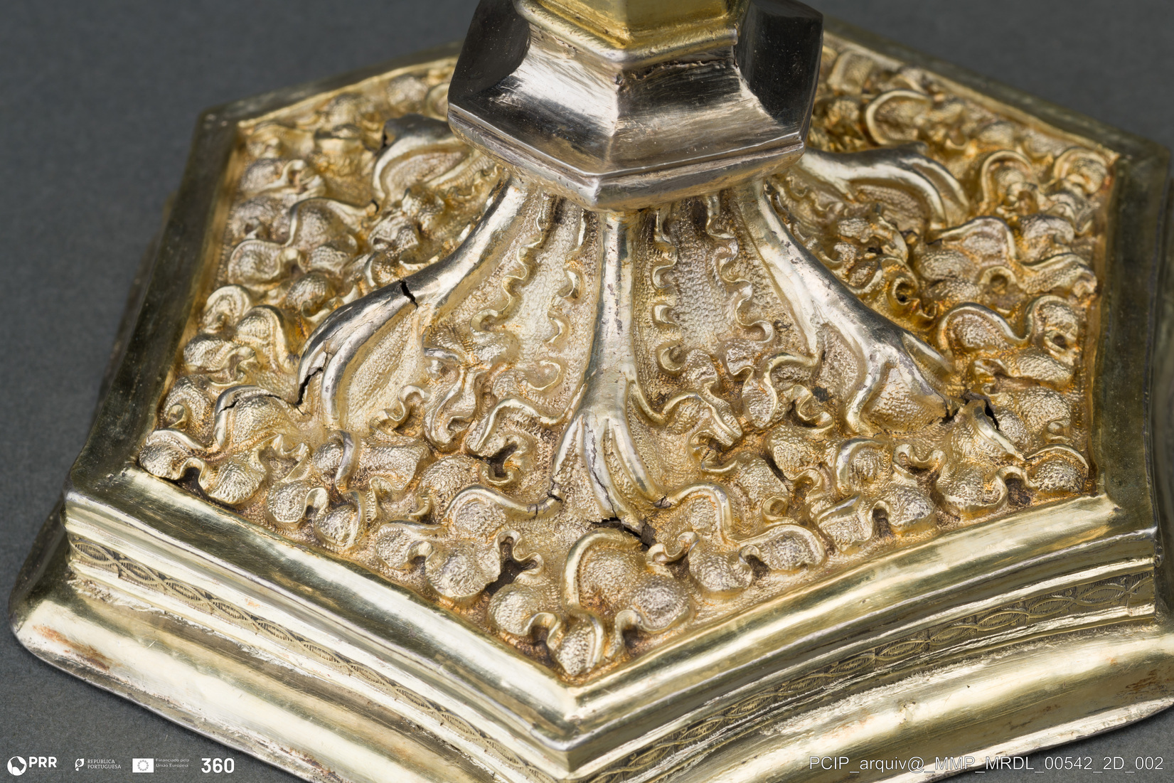 Matéria/Técnica: Prata Dourada; Cronologia: Desconhecida; Autoria: Desconhecida; Dimensões: Altura: 22,50 cm; Diâmetro: 13,58 cm; Peso: 465,90 gr.
