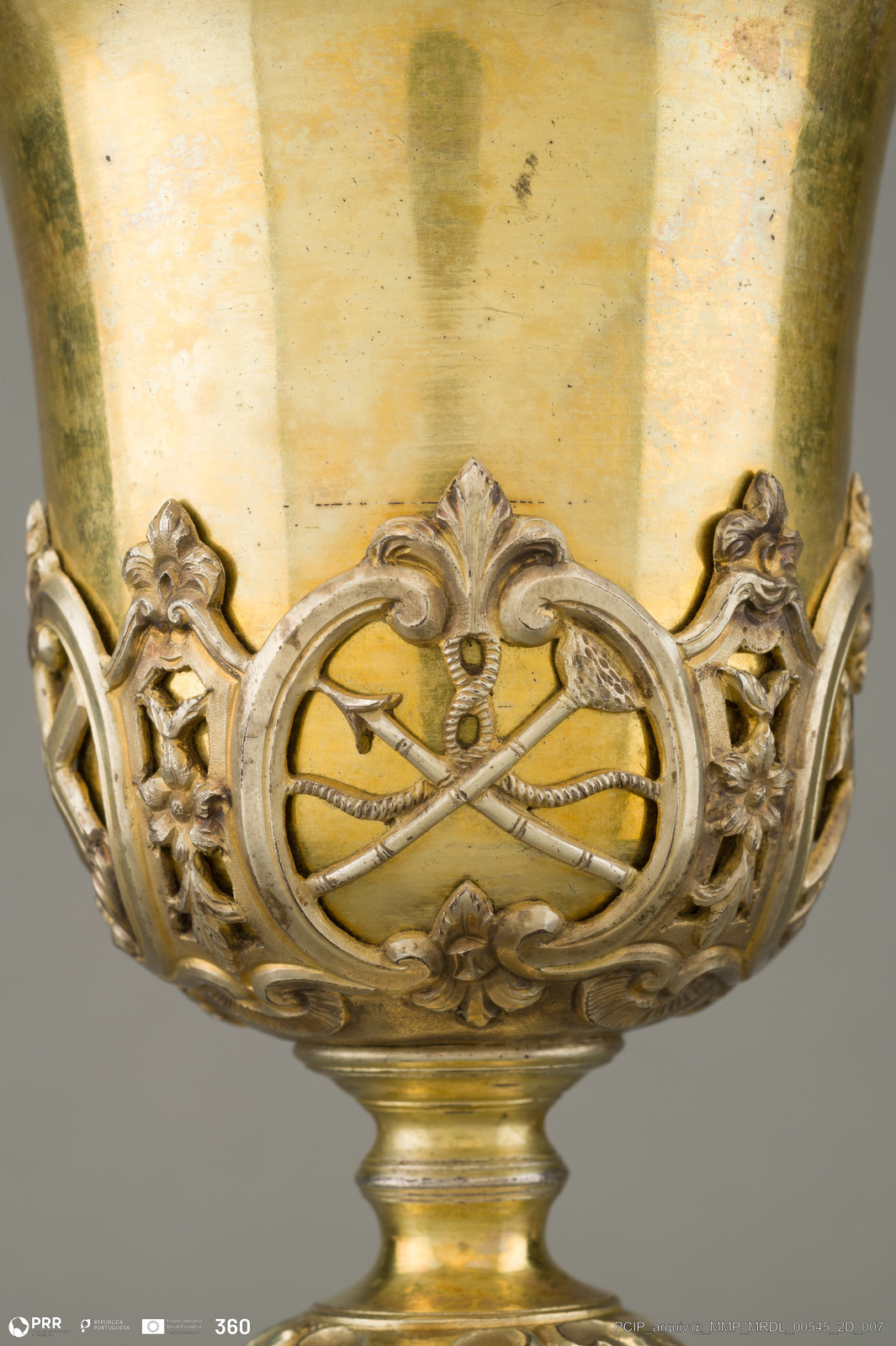 Matéria/Técnica: Prata Dourada; Cronologia: Desconhecida; Autoria: Desconhecida; Dimensões: Altura: 29,00 cm; Diâmetro: 14,20 cm; Peso: 881,00 gr.