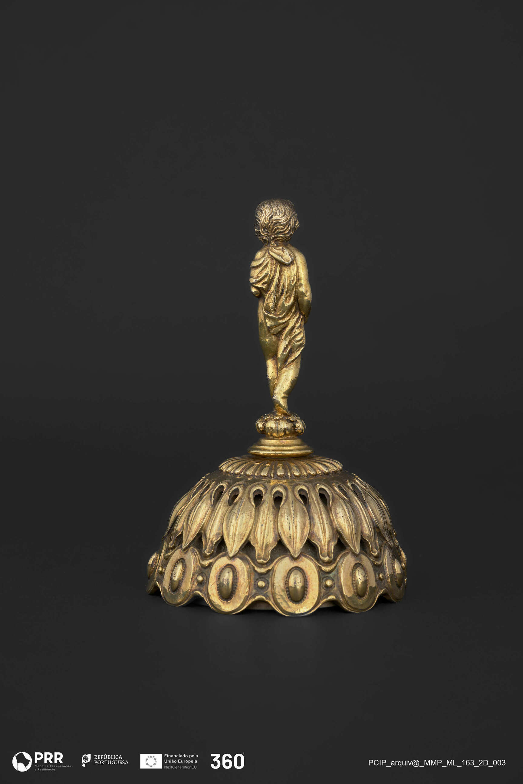 Matéria/Técnica: Dourada, fundida, cinzelada e vazada.; Cronologia: Século XVII; Autoria: Desconhecida; Dimensões (cm): Altura: 14 x Diâmetro: (base) 8,6.