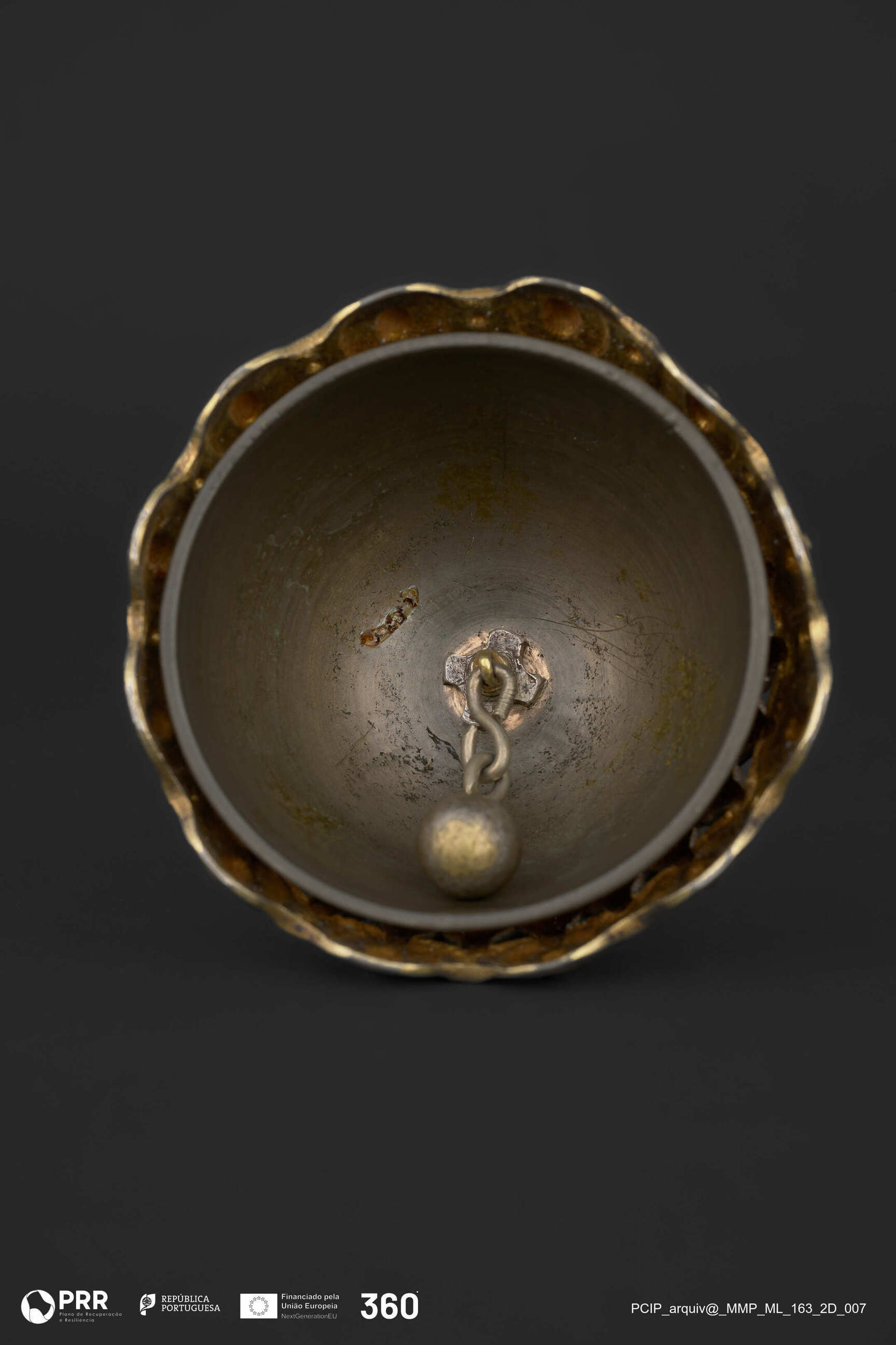 Matéria/Técnica: Dourada, fundida, cinzelada e vazada.; Cronologia: Século XVII; Autoria: Desconhecida; Dimensões (cm): Altura: 14 x Diâmetro: (base) 8,6.