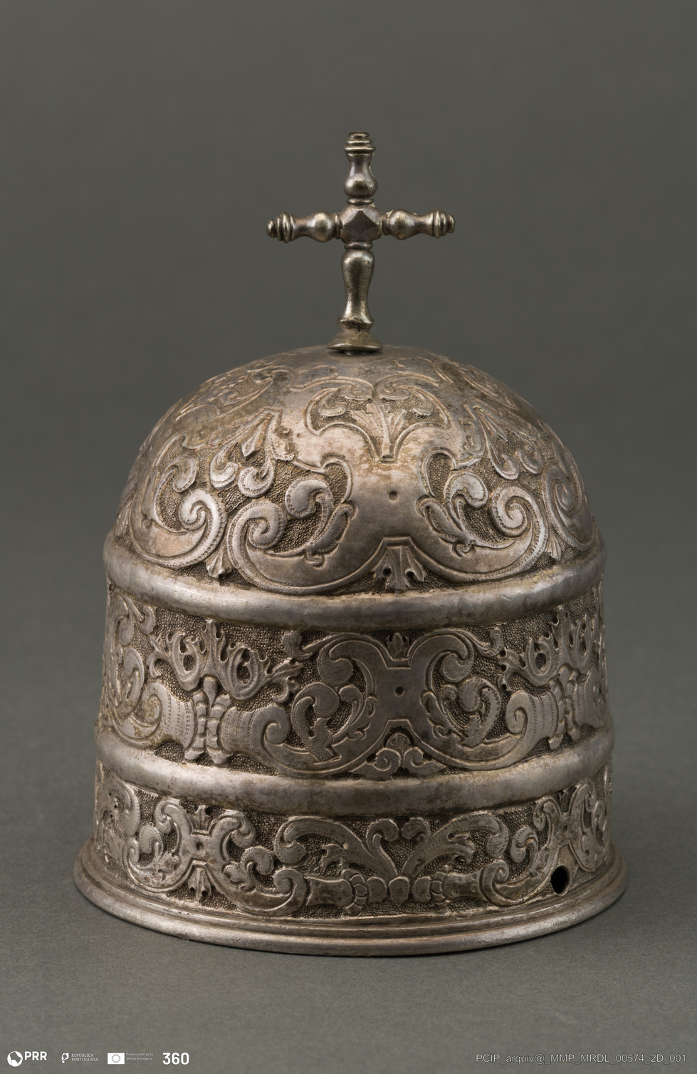 Matéria/Técnica: Prata; Cronologia: Desconhecida; Autoria: Desconhecida; Dimensões: Altura: 12,70 cm; Diâmetro: 9,65 cm; Peso: 233,80 gr.