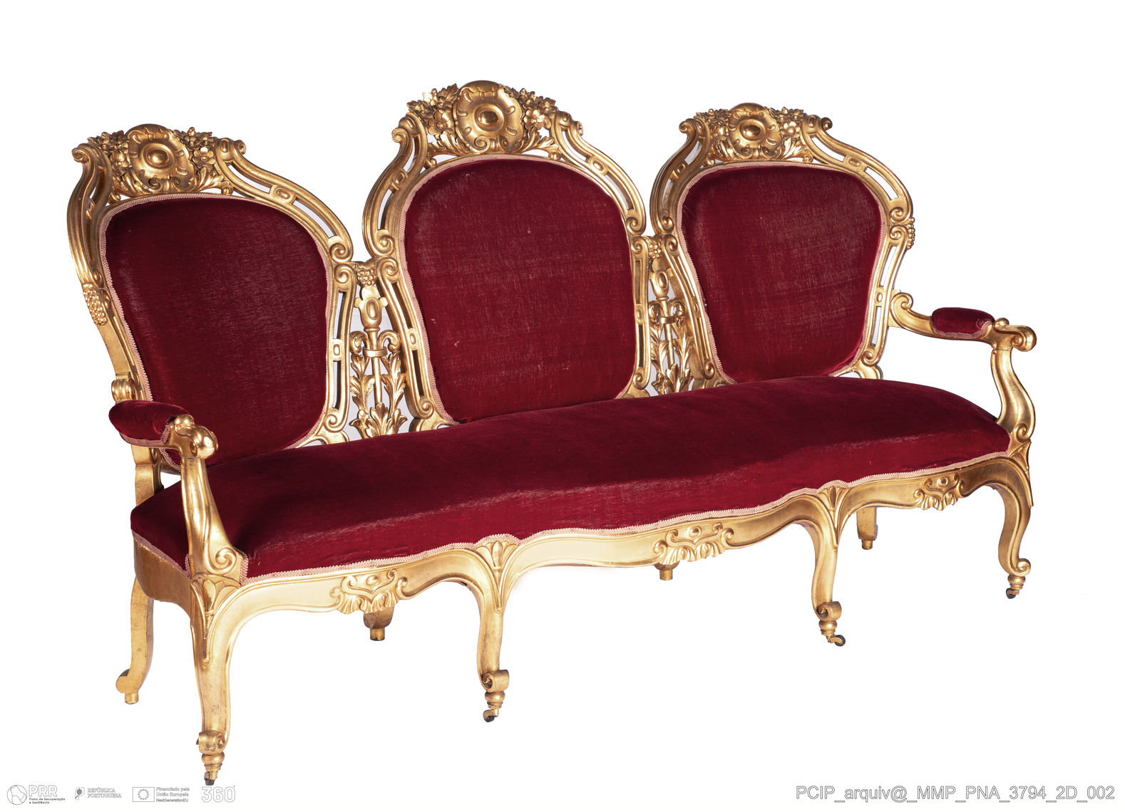 Matéria/Técnica: Madeira de mogno das honduras; folha de ouro; veludo, galão de seda; Cronologia: 1860 - 1889; Autoria: Desconhecida; Dimensões (cm): Altura: 123; Largura: 217; Profundidade: 70,0.