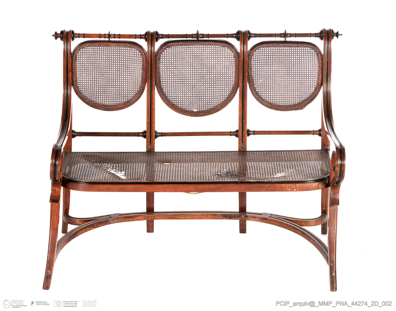 Matéria/Técnica: Madeira; vime; Cronologia: Século XIX; Autoria: Desconhecida; Dimensões (cm): Altura: 69; Largura: 94; Comprimento: 47.