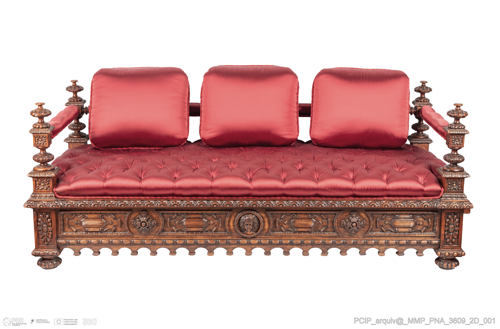 Matéria/Técnica: Madeira de carvalho; cetim; Cronologia: 1850 - 1889; Autoria: Desconhecida; Dimensões (cm): Altura: 80,0; Largura: 208; Profundidade: 91,0.