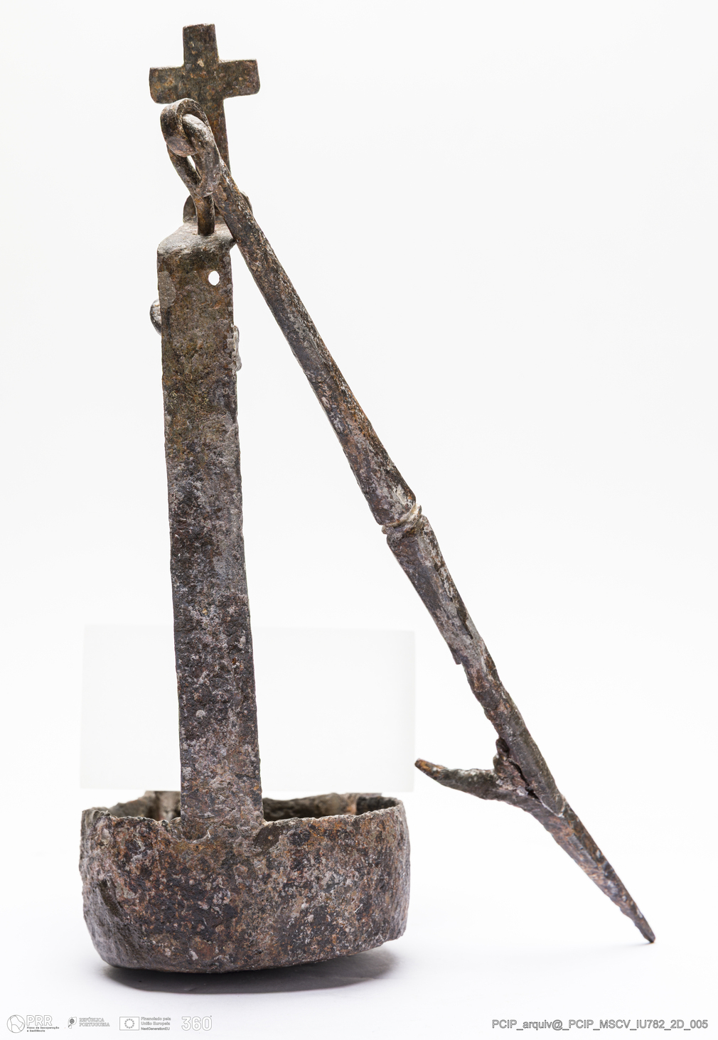 Matéria/Técnica: Metal ferro (?); Cronologia: Século XVII; Autoria: Desconhecida; Dimensões: Altura: 260mm; Diâmetro: 95mm; Altura: 30mm.