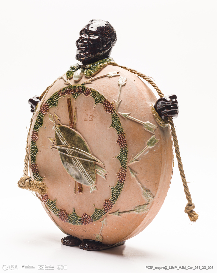 Matéria/Técnica: Barro cozido e vidrado; Cronologia: 1898; Autoria: Avelino Belo; Dimensões: Comprimento: 20,7 x Altura: 23,7 x Largura: 6,8 cm.