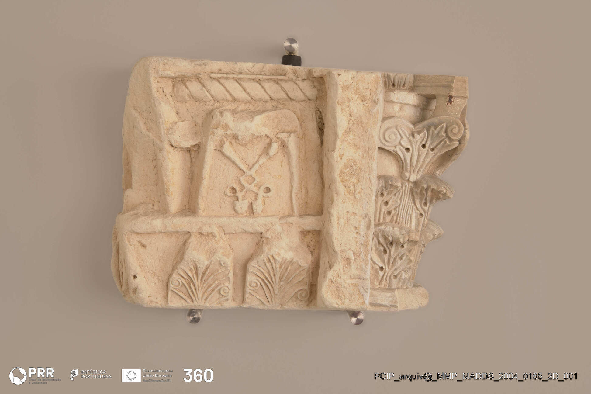 Matéria/Técnica: Calcário; Cronologia: Século VI d.C; Autoria: Desconhecida; Dimensões (cm): 27 x 38 x 20.