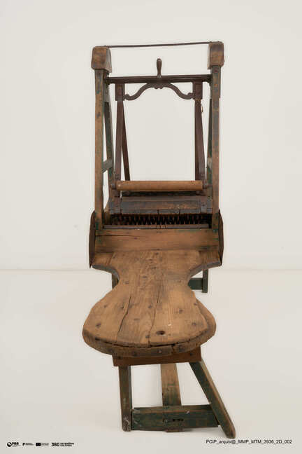 Matéria/Técnica: Madeira e ferro; Cronologia: Séc. XIX / Séc. XX; Autoria: Desconhecida; Dimensões (cm): 104 x 45 x 123 cm.