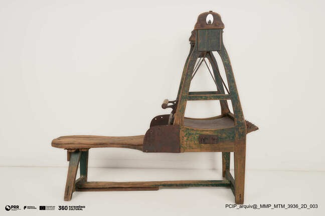 Matéria/Técnica: Madeira e ferro; Cronologia: Séc. XIX / Séc. XX; Autoria: Desconhecida; Dimensões (cm): 104 x 45 x 123 cm.