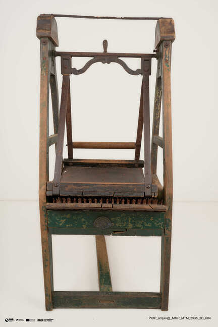 Matéria/Técnica: Madeira e ferro; Cronologia: Séc. XIX / Séc. XX; Autoria: Desconhecida; Dimensões (cm): 104 x 45 x 123 cm.