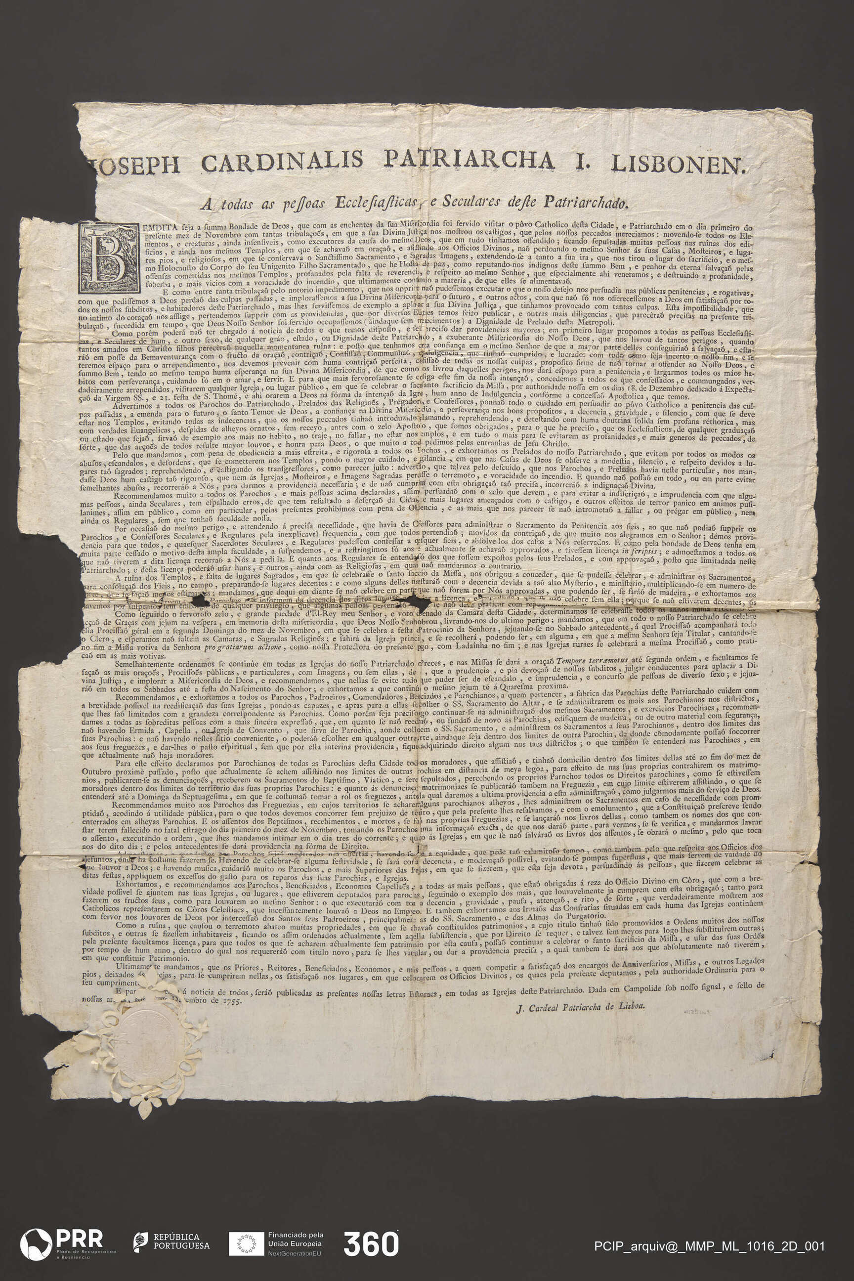 Matéria/Técnica: Impressão; Cronologia: 1755; Autoria: Cardinalis, Josephus - Cardeal Patriarca de Lisboa; Dimensões (cm): Altura: 58,5 x Largura: 47.
