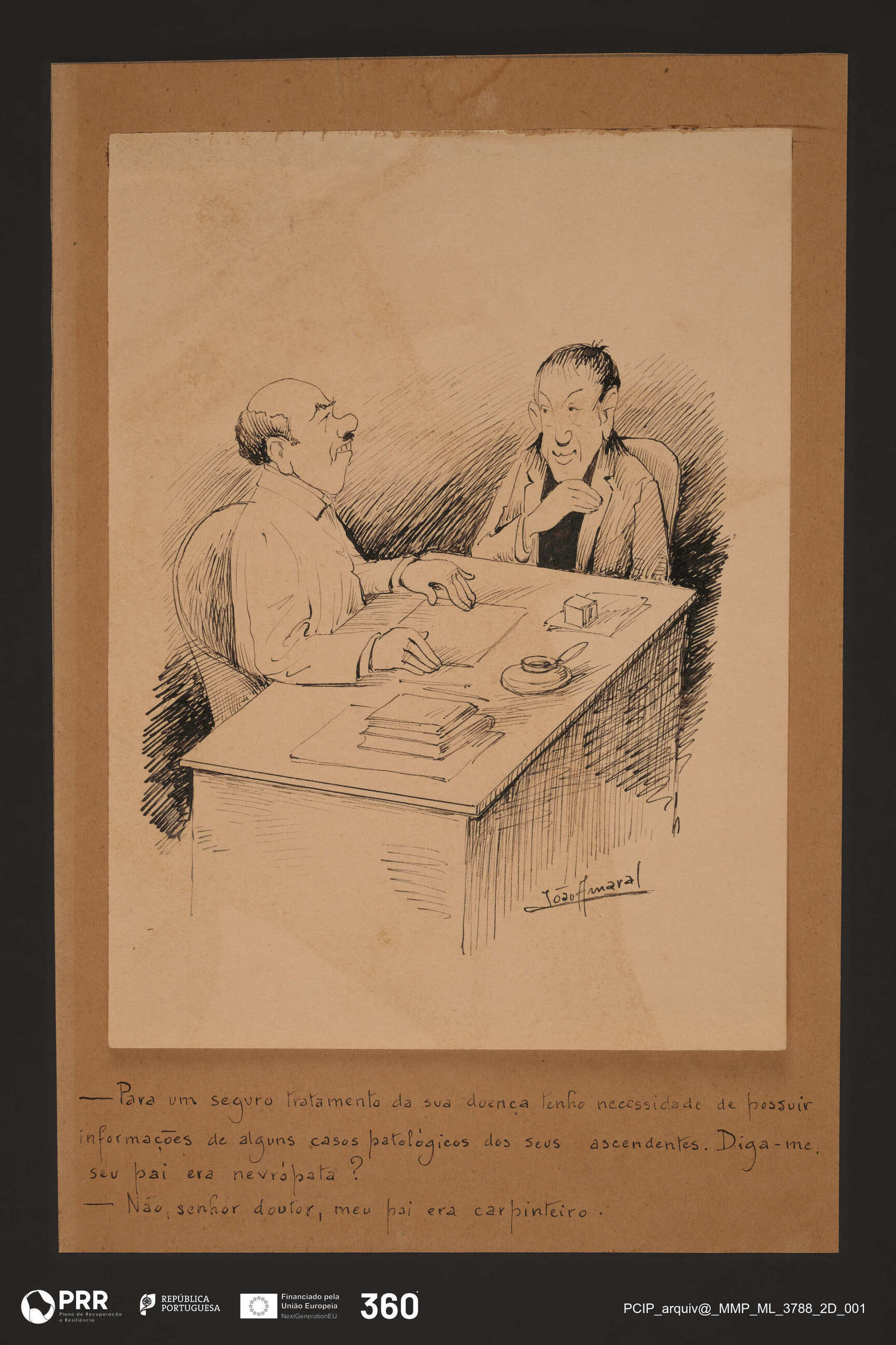 Matéria/Técnica: Desenho à pena; Cronologia: Séculos XIX - XX; Autoria: Amaral, João (1874 - 1955); Dimensões (cm): Altura: 23 (desenho), 30 (suporte) x Largura: 17 (desenho), 19,8 (suporte).