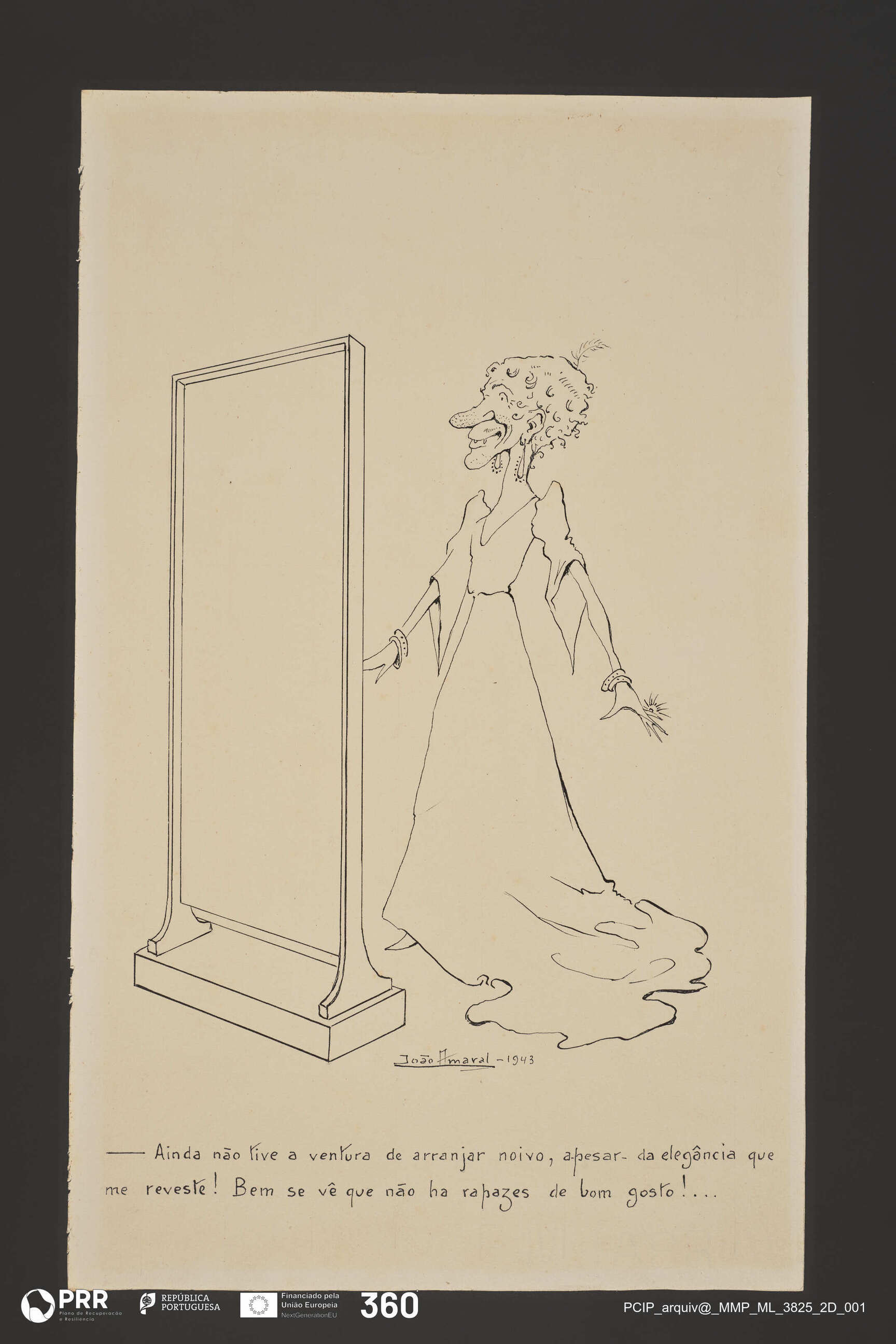 Matéria/Técnica: Desenho à pena; Cronologia: 1943; Autoria: Amaral, João (1874 - 1955); Dimensões: Altura: 426 mm x Largura: 261 mm.
