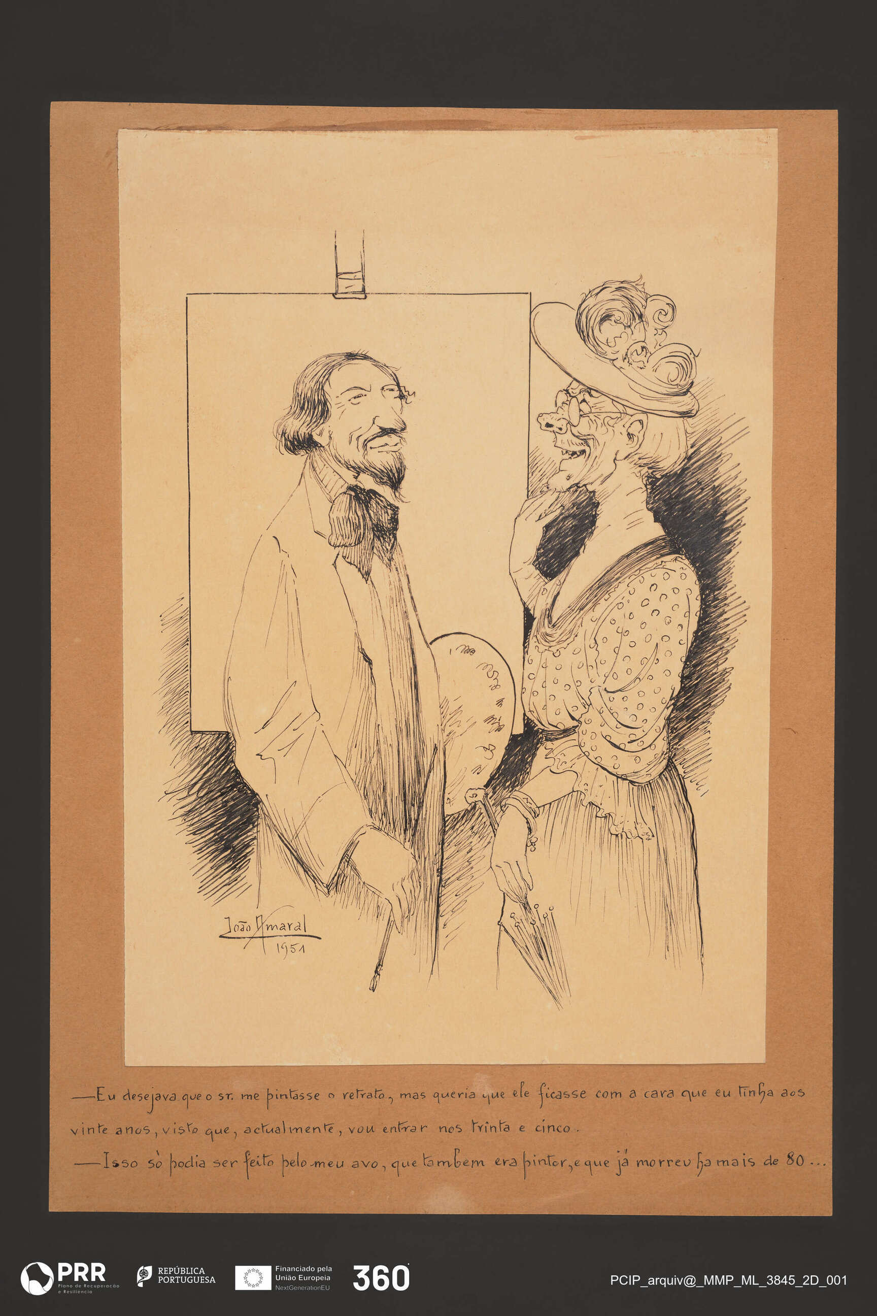 Matéria/Técnica: Desenho à pena; Cronologia: 1951; Autoria: Amaral, João (1874 - 1955); Dimensões (cm): Altura: 29,5 (desenho), 35 (suporte) x Largura: 20,5 (desenho), 25 (suporte).