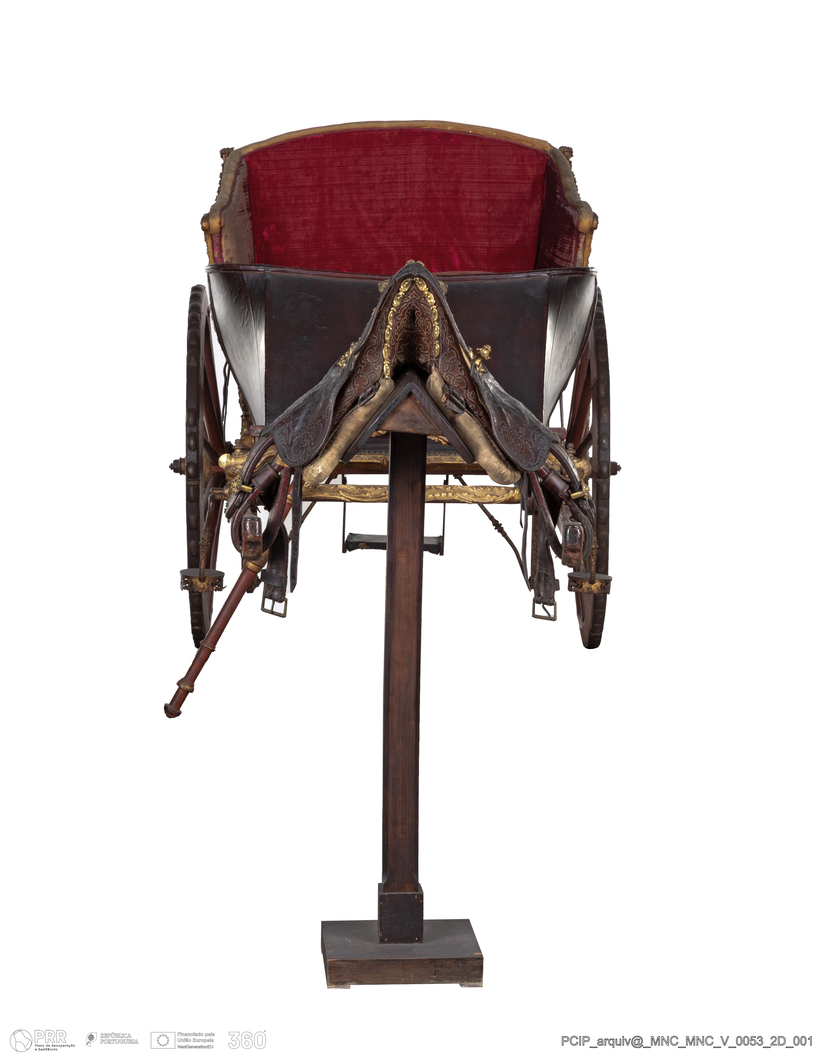 Matéria/ Técnica: Madeira; couro; ferro; veludo de seda; Cronologia: 1780 - 1790; Autoria: Desconhecida; Dimensões (cm): Altura: 150; Largura: 130; Espessura: 4 (rodas); Diâmetro: 120 (rodas); Comprimento: 387.