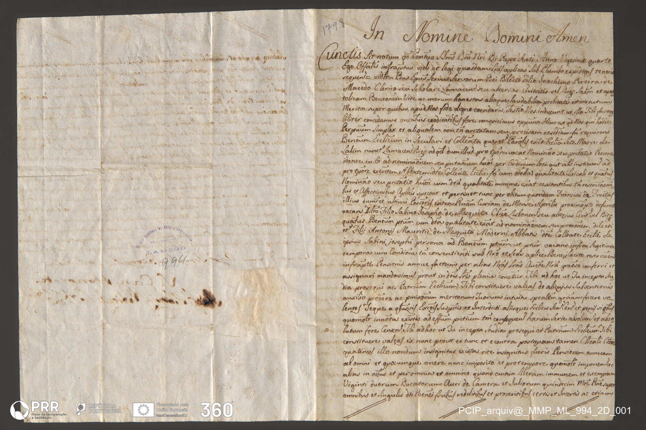 Matéria/Técnica: Escrita à pena em letra caligráfica; Cronologia: 1798; Autoria: Desconhecida; Dimensões (cm): Altura: 26,7 x Largura: 39.