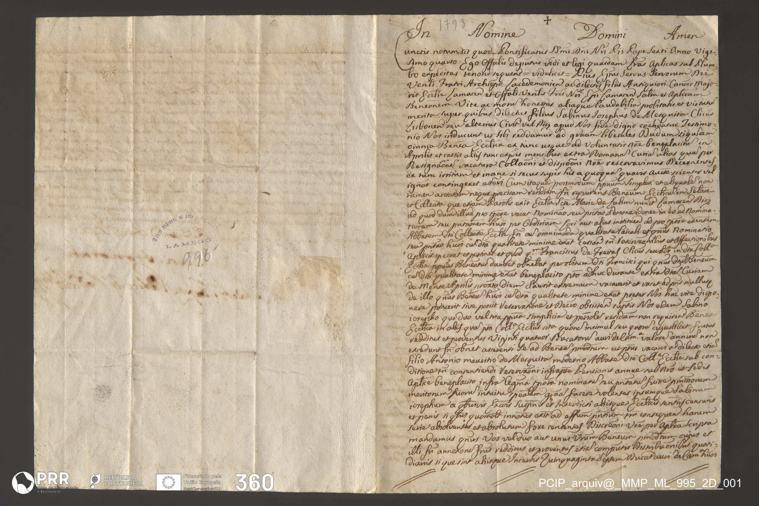 Matéria/Técnica: Escrita à pena em letra caligráfica; Cronologia: 1798; Autoria: Desconhecida; Dimensões (cm): Altura: 26,5 x Largura: 38,2.