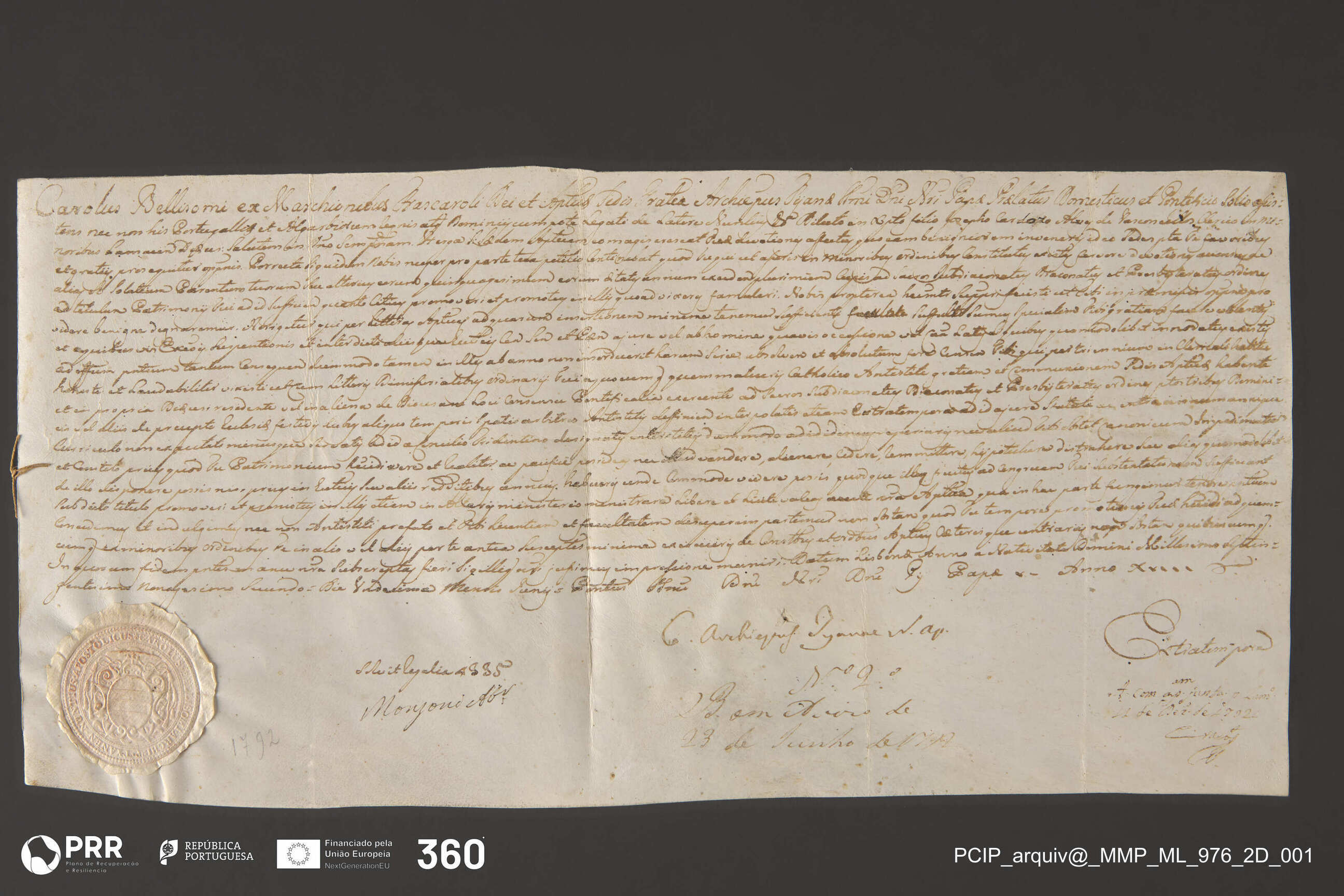 Matéria/Técnica: Escrito à pena em letra caligráfica moderna. Selo de chapa firmado com lacre.; Cronologia: 1792; Autoria: Desconhecida; Dimensões (cm): Altura: 22 x Largura: 44,3.