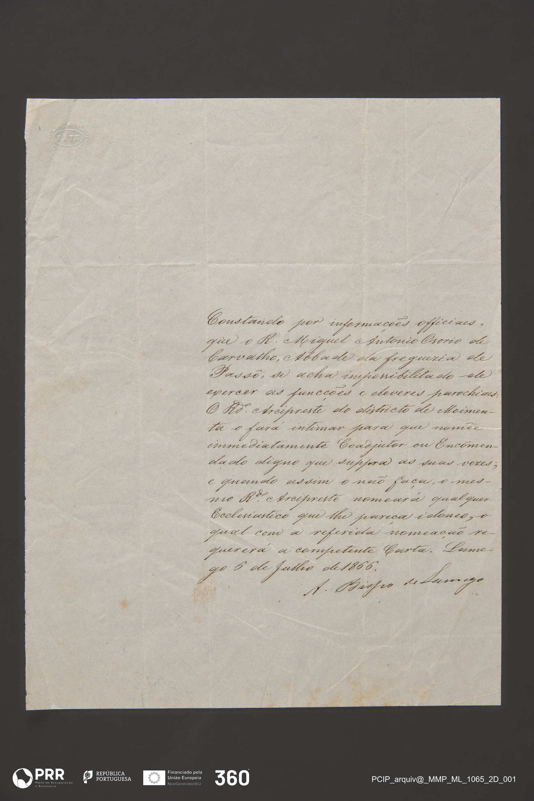 Matéria/Técnica: Escrito à pena com letra caligráfica; Cronologia: 1866; Autoria: Bispo de Lamego; Dimensões (cm): Altura: 25 x Largura: 19,5.