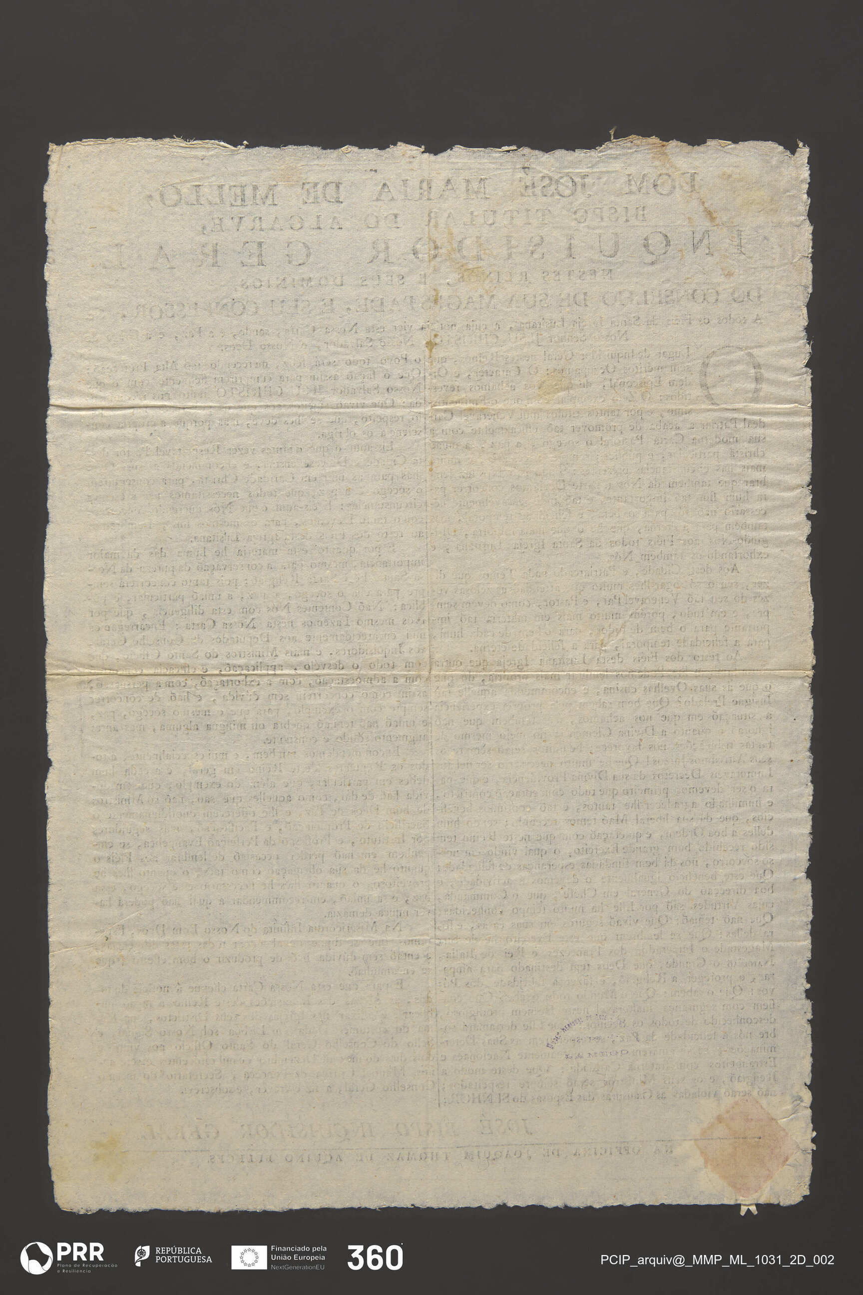 Matéria/Técnica: Impressão; Cronologia: 1807; Autoria: Mello, D. José Maria de - Bispo Titular do Algarve e Inquisidor Geral; Dimensões (cm): Altura: 42,5 x Largura: 31.