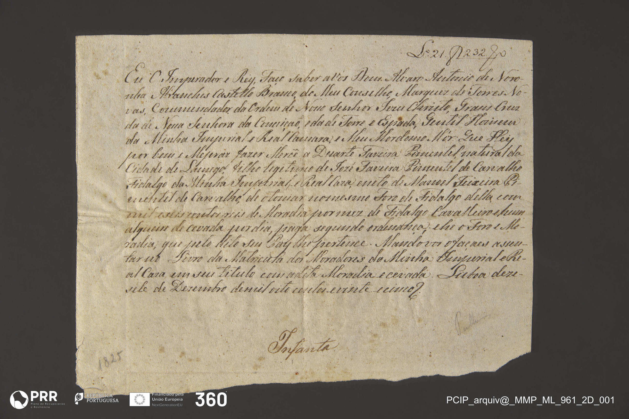 Matéria/Técnica: Escrito à pena em letra caligráfica moderna.; Cronologia: 1825; Autoria: Desconhecida; Dimensões (cm): Altura: 20,2 x Largura: 25,7.