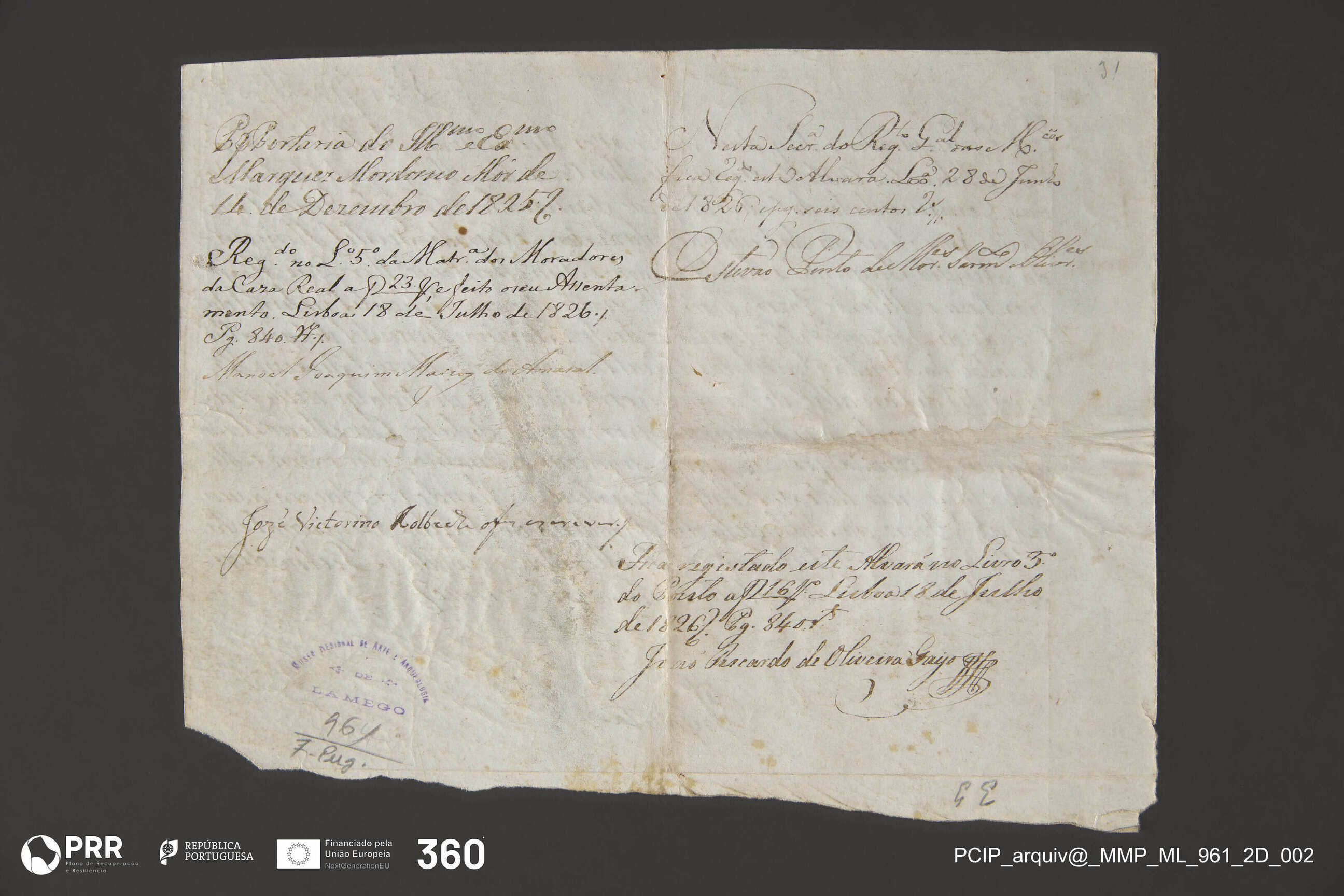 Matéria/Técnica: Escrito à pena em letra caligráfica moderna.; Cronologia: 1825; Autoria: Desconhecida; Dimensões (cm): Altura: 20,2 x Largura: 25,7.