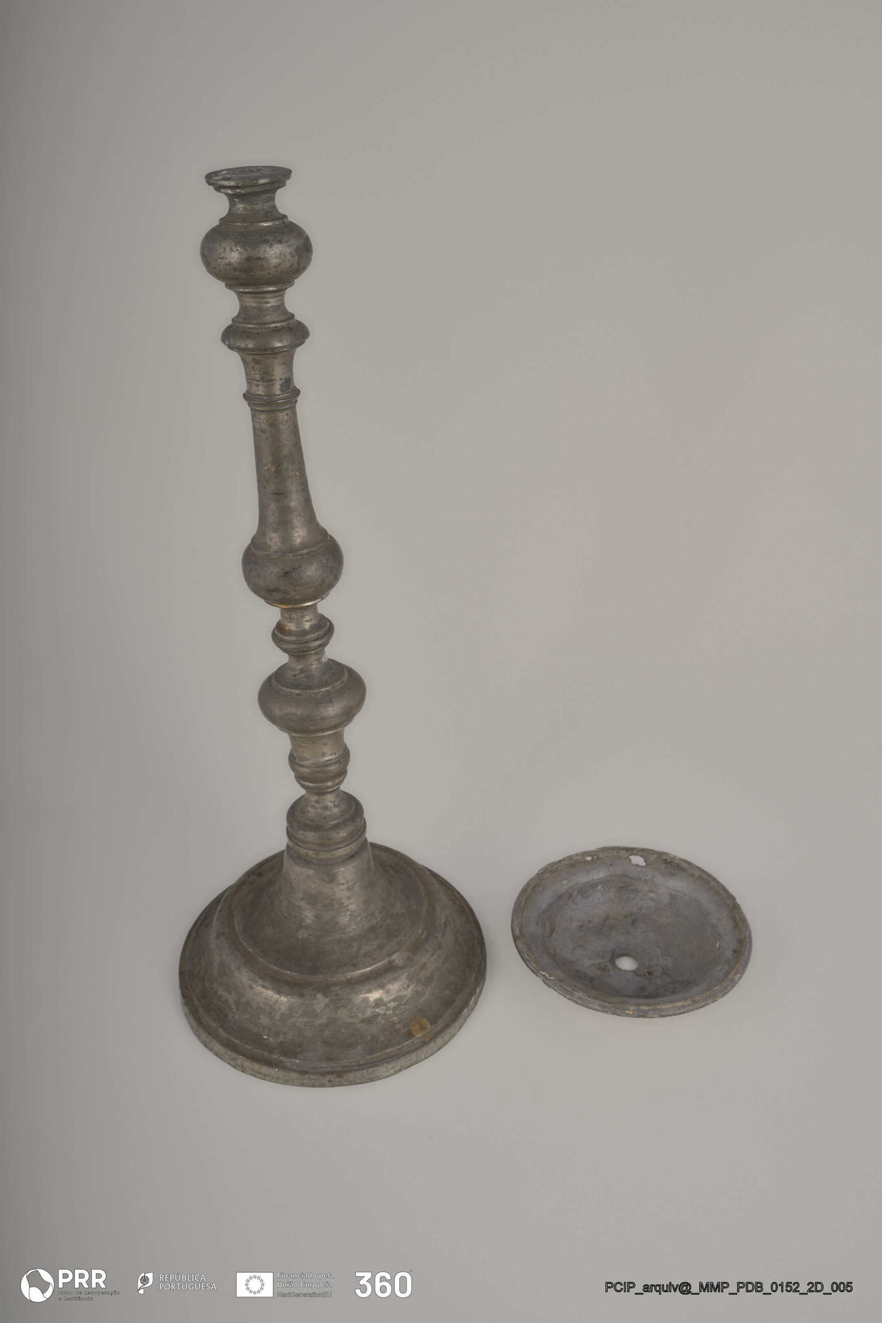 Matéria/Técnica: Desconhecida; Cronologia: Século XVII; Autoria: Desconhecida; Dimensões (cm): Altura: 42; Diâmetro: Vela - 2,5 Fundo - 13,6.