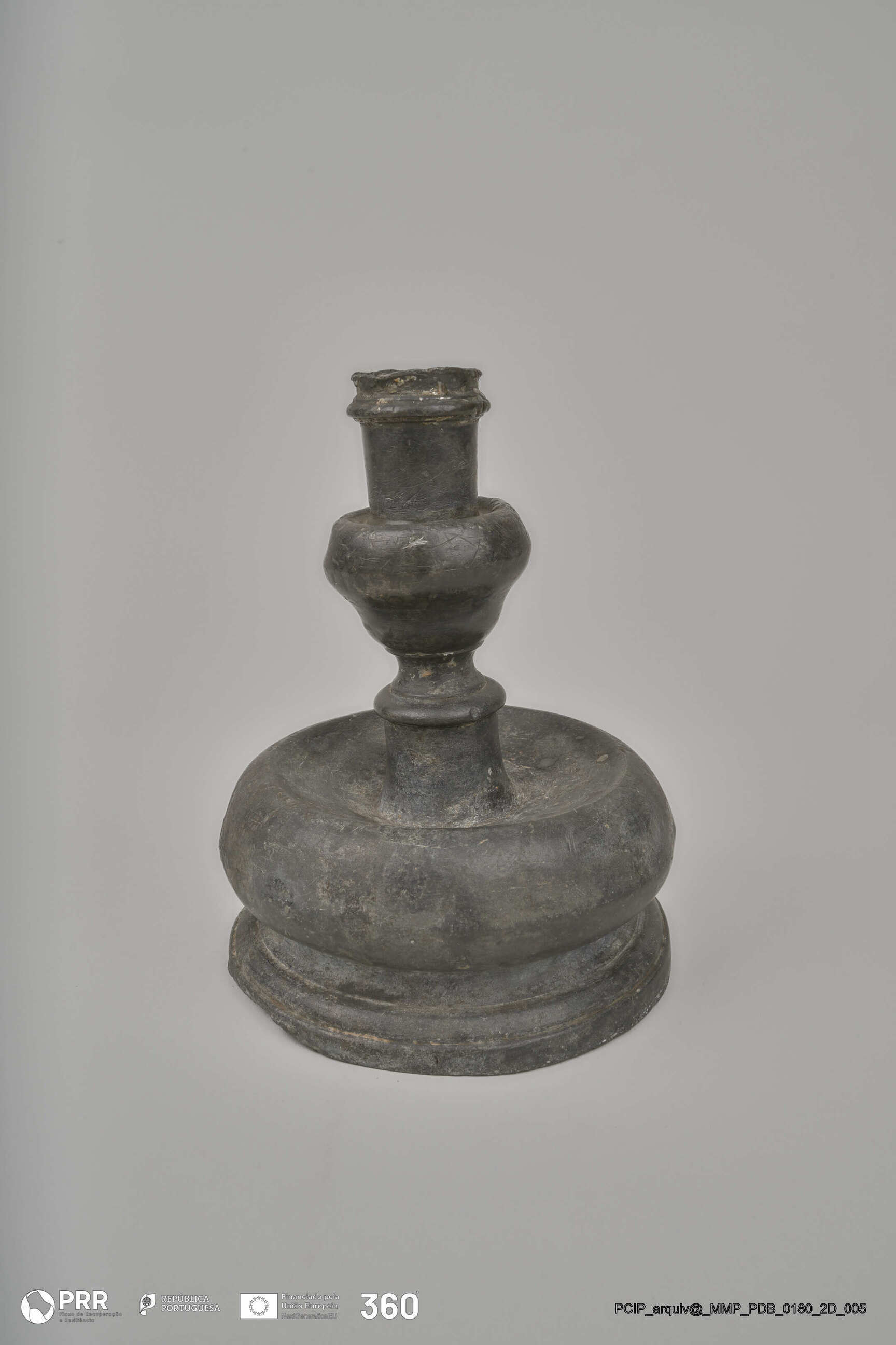 Matéria/Técnica: Desconhecida; Cronologia: Século XVII; Autoria: Desconhecida; Dimensões (cm): Altura: 17,5; Diâmetro: Vela - 2,8 Base - 12,6.