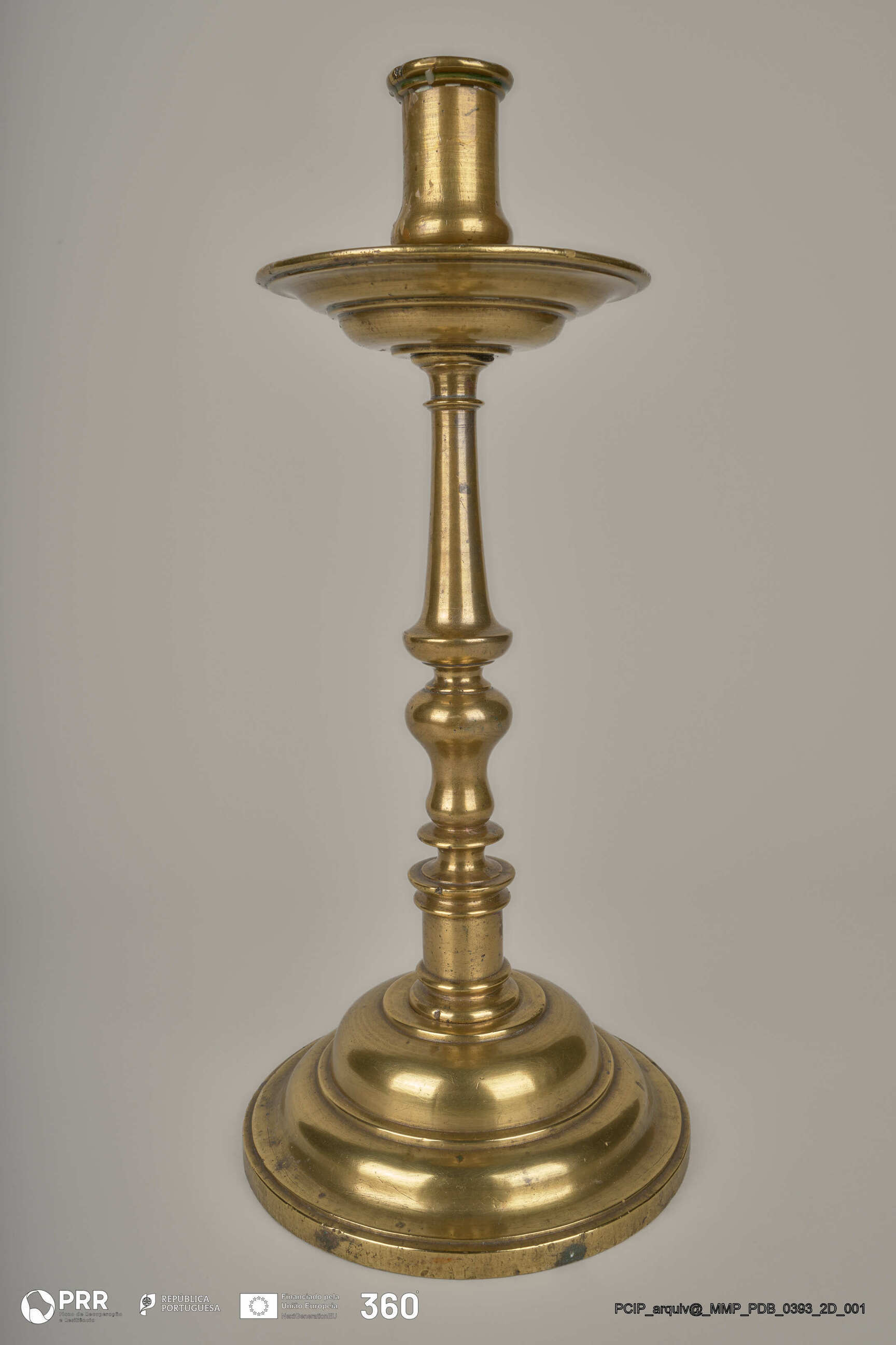 Matéria/Técnica: Desconhecida; Cronologia: Século XVIII; Autoria: Desconhecida; Dimensões (cm): Altura: 34,7; Diâmetro: Vela - 3,8 Base - 15,5.