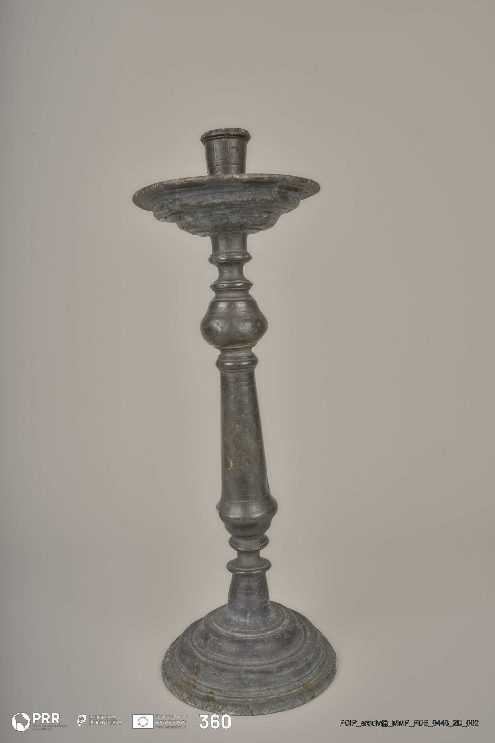 Matéria/Técnica: Desconhecida; Cronologia: Século XVII; Autoria: Desconhecida; Dimensões (cm): Altura: 43; Diâmetro: Base - 14,5 Vela - 2,6.