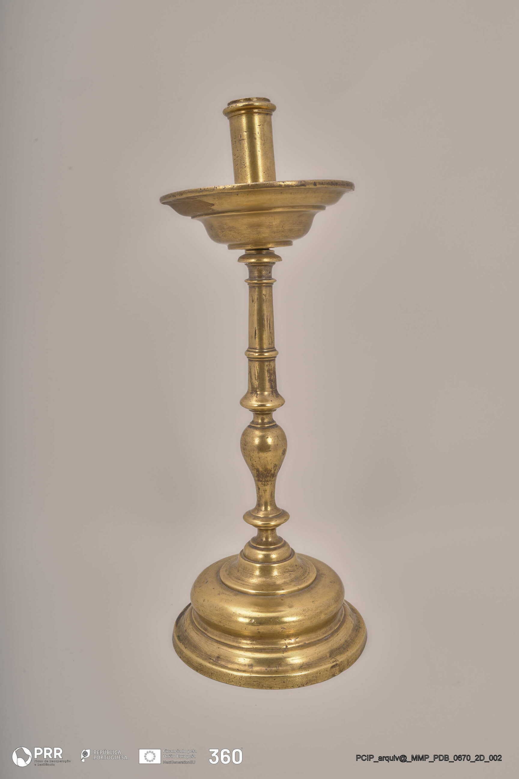 Matéria/Técnica: Desconhecida; Cronologia: Século XVII; Autoria: Desconhecida; Dimensões (cm): Altura: 37,7; Diâmetro: Base - 14,7 Vela - 2,5.