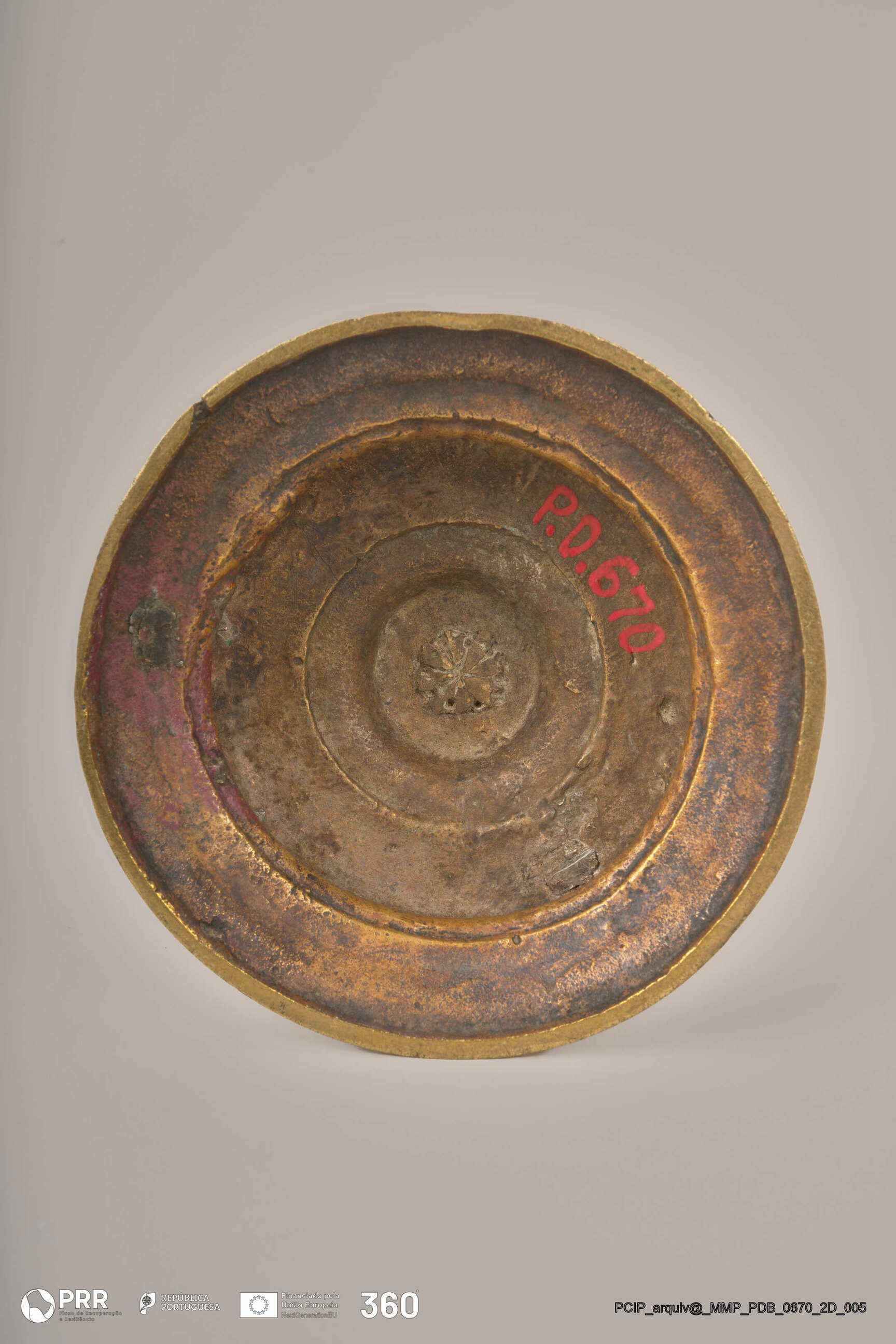 Matéria/Técnica: Desconhecida; Cronologia: Século XVII; Autoria: Desconhecida; Dimensões (cm): Altura: 37,7; Diâmetro: Base - 14,7 Vela - 2,5.